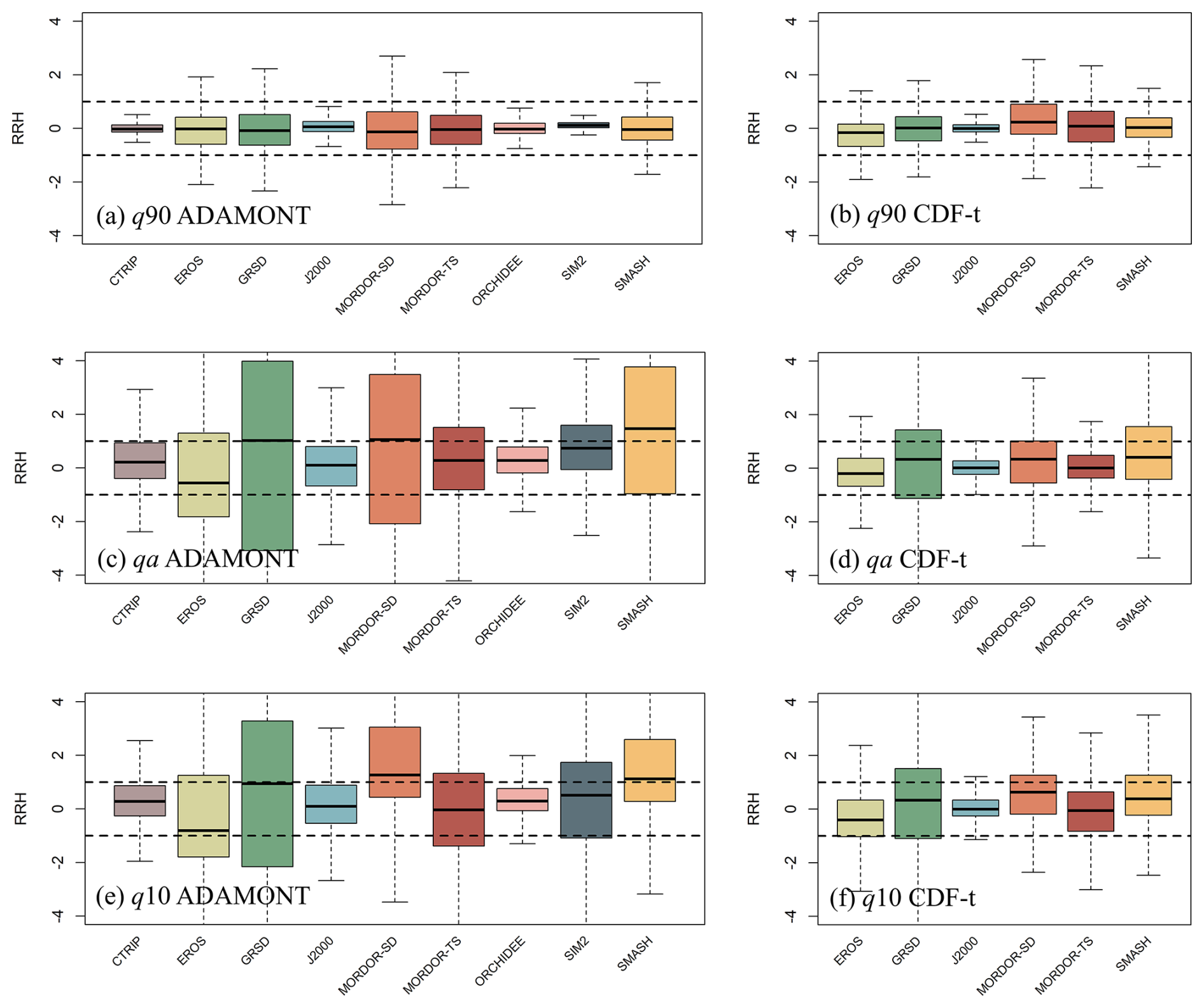 To be used as inputs to hydrological models (HMs), RCM outputs were post-processed (including bias correction and downscaling). Several BCs have been tested. Finally two BCs were applied in the Explore2 project, namely ADAMONT (Verfaillie et al., 2017) and CDF-t (Michelangeli et al., 2009) after a preliminary assesment (in particular, based on the realism of the rainfall fields). These two variants of the quantile-mapping approach force the statistical distribution of the simulated variables to match that of the 8 km regular grid SAFRAN over 1976–2005 that forms the baseline reference climate for the project. Both methods are univariate and applied independently to the outputs of each GCM/RCM pair. Unlike CDF-t, the ADAMONT method was also able to compute and deliver bias-corrected data at the hourly time step.