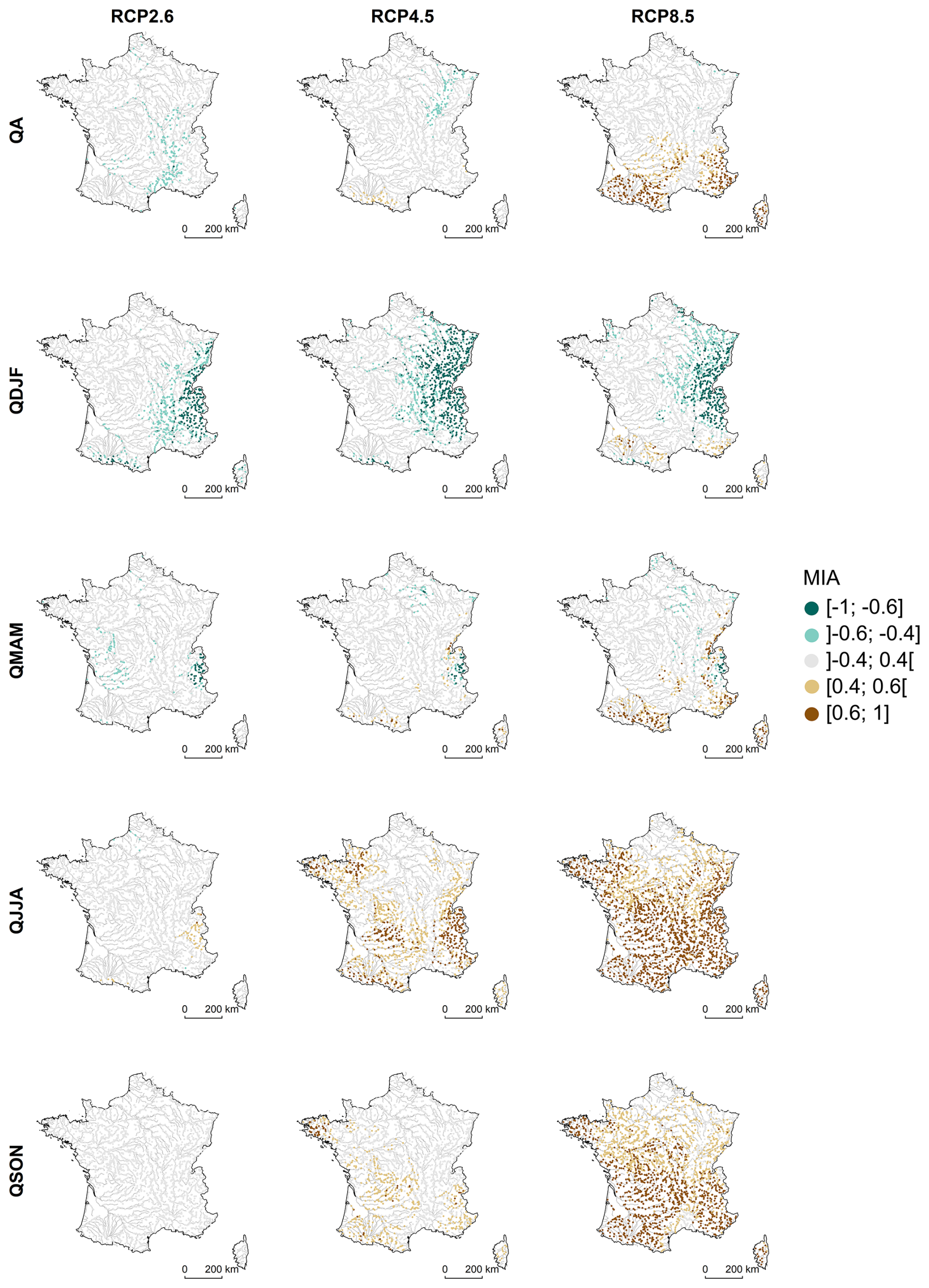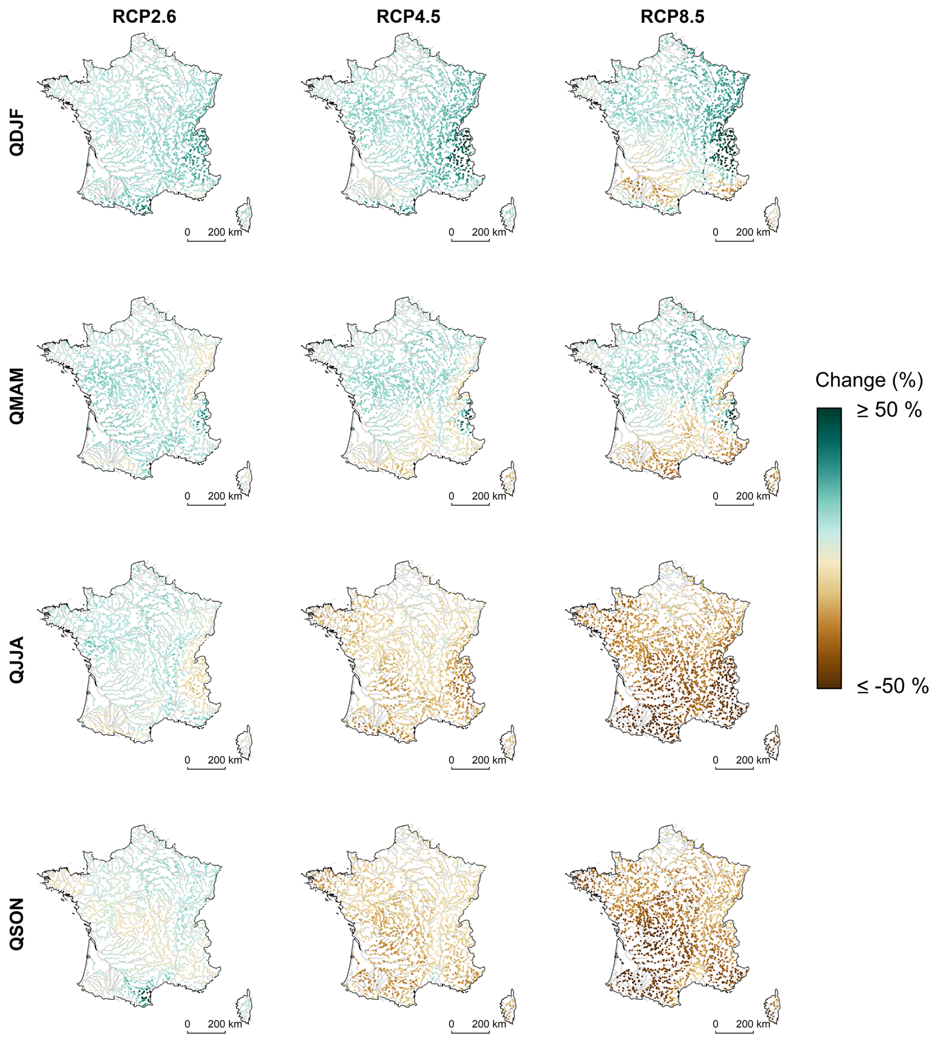 This large set of hydrological projections shows a high model agreement on the decrease in seasonal flows in the South of France under the RCP8.5 high-emission scenario, confirming its hotspot status. The surface hydrological models agree on the decrease in summer flows across France under the RCP8.5 scenario, with the exception of northern part France. This area may indeed benefit from more active winter recharge that may counterbalance decrease in summer precipitation and increase in evapotranspiration. In addition to northern France, annual groundwater recharge is projected to increase slightly in the north-east while remaining unchanged elsewhere by the end of the century, according to the RCP8.5 scenario. In the mountainous areas, winter flows will increase as a result of higher air temperature and the high degree of agreement between the models holds regardless of the RCP considered. Unsurprisingly, the higher the GHG emission scenario, the higher the median changes. Most of these changes are organised in France along a north-south gradient, regardless of the RCP considered.