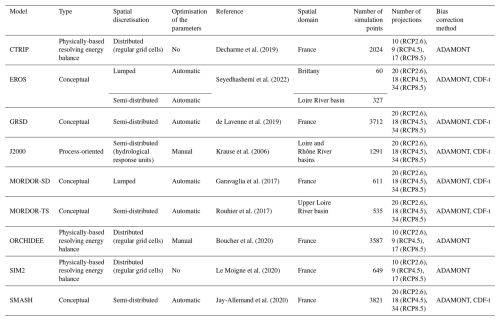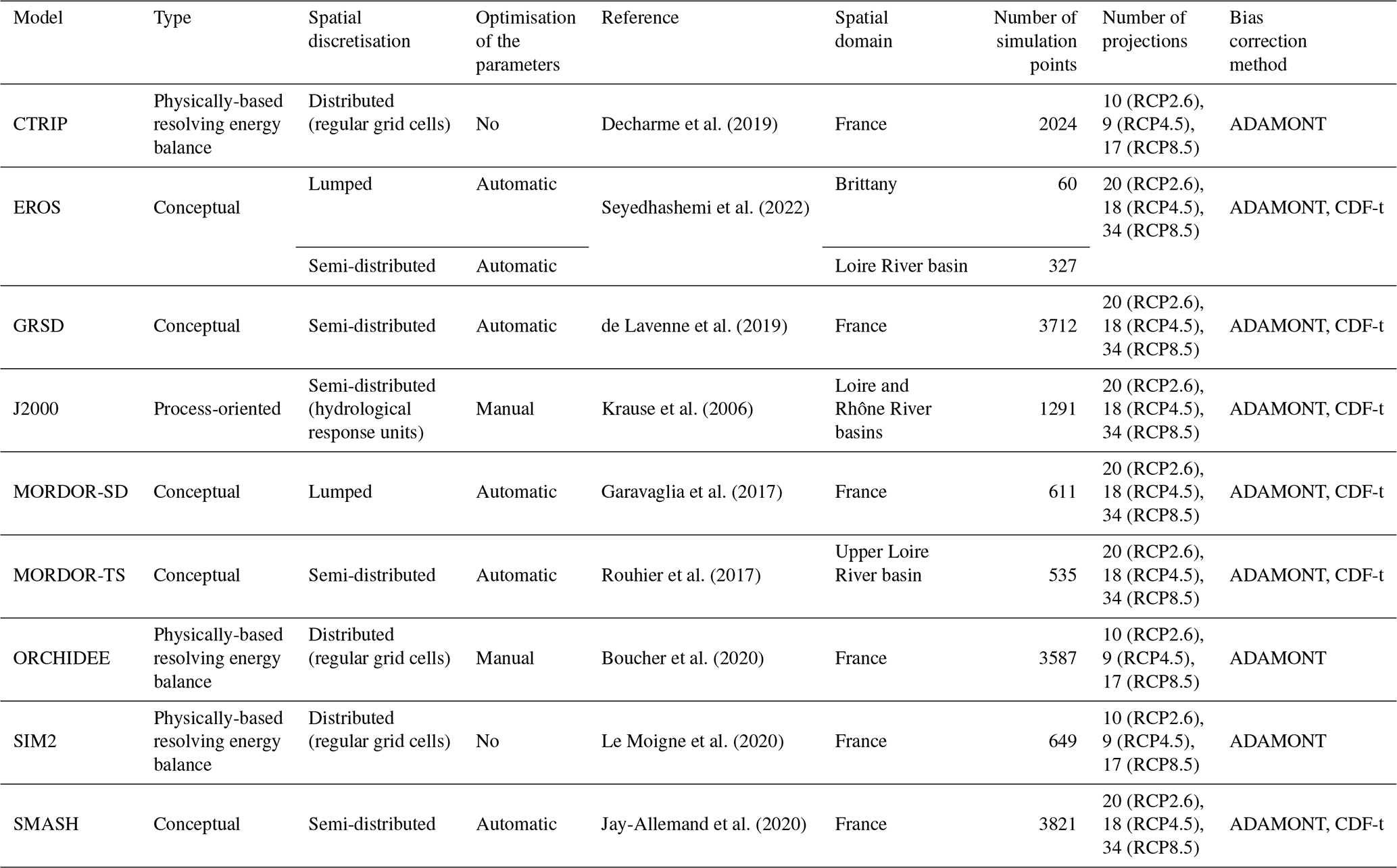 Most of these models have been extensively used in previous climate change impact and adaptation studies in large French catchments (see e.g. Amraoui et al., 2019; Lemaitre-Basset et al., 2024; Morel et al., 2022; Seyedhashemi et al., 2022; Thirel et al., 2019; Vergnes et al., 2023).