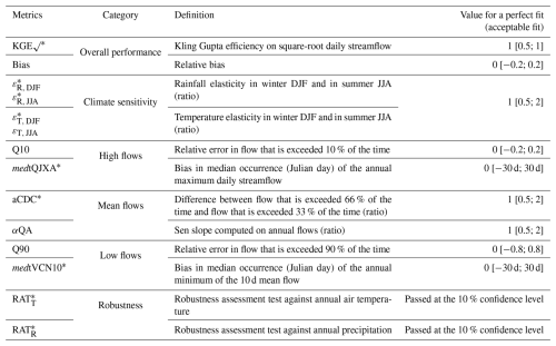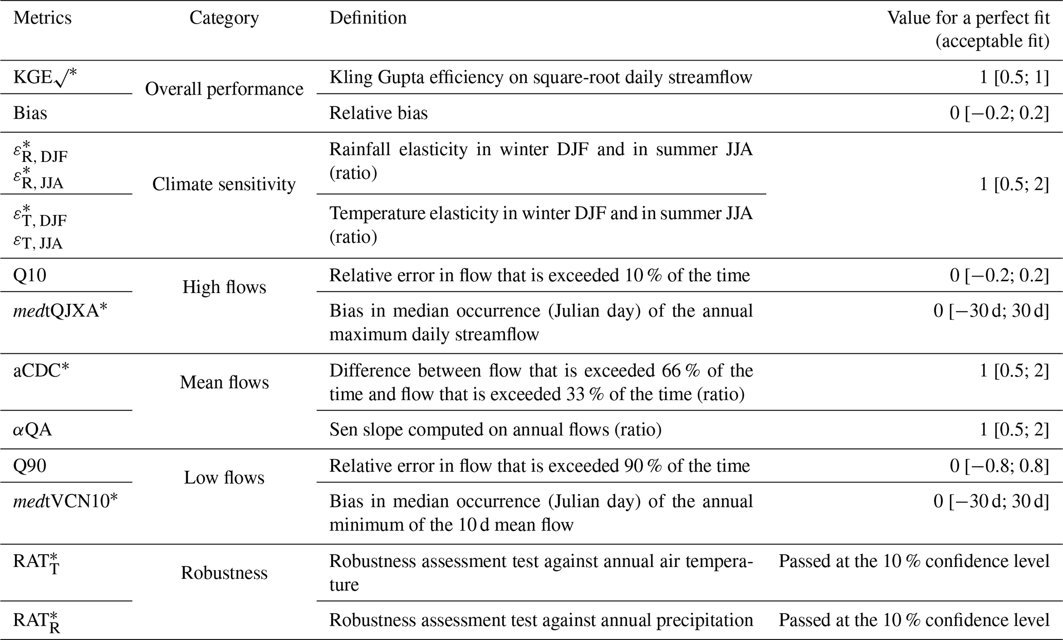 Table 3Metrics used for the evaluation of streamflow simulations. Metrics with * are detailed in the Supplementary materials (Table S1).