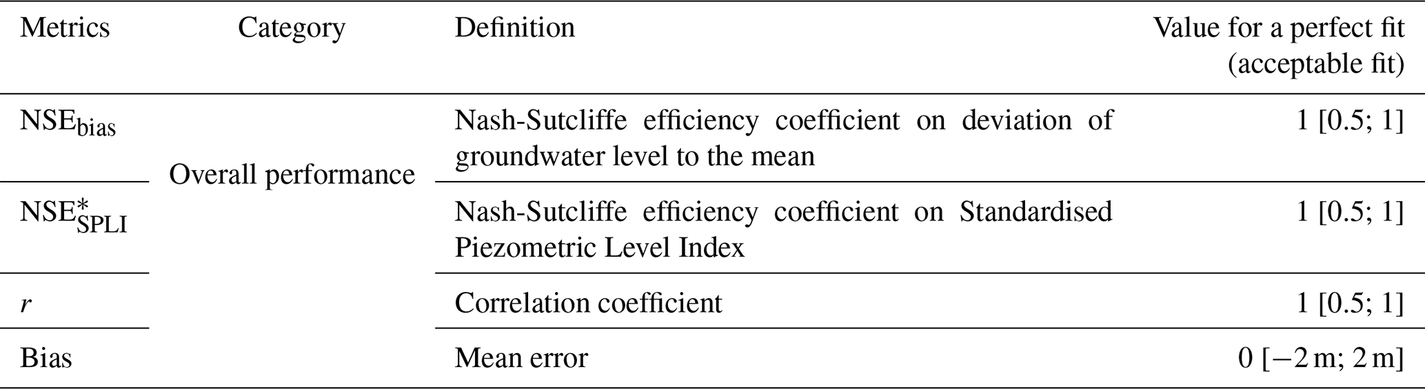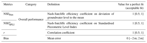 A set of 12 metrics and two tests were selected to evaluate the surface HMs across the flow regime. These metrics, detailed in Table 3, are complementary and evaluate different aspects of the hydrological time series: overall performance, climate sensitivity, high flows, mean flows, low flows, and robustness. Criteria assessing the overall performance are the Bias and the Kling Gupta efficiency (Gupta et al., 2009) KGE√ applied to square-root daily streamflow (giving roughly equivalent weight to high flows and low flows). The sensitivity of streamflow to precipitation and temperature is assessed through climatic elasticity indices (εR, DJF, εR,JJA, εT, DJF, εT, JJA, Sankarasubramanian et al., 1991), which may help understanding contrasting responses of HMs under climate change. High, mean, and low flows and associated processes are assessed with a set of six hydrological signatures (Q10, medtQJXA, aCDC, αQA, Q90, medtVCN10). The choice of the metrics was partly supported by the analysis of the correlation matrix between pairs of around 50 metrics suggested by modellers (highly correlated metrics were removed from the initial set of metrics). Finally, the robustness assessment test (RAT, Nicolle et al., 2021) is based on the identification of a correlation between model errors and temperature (RATT) or precipitation (RATR). The Spearman correlation ρ between model bias and meteorological variables was computed, and the robustness for the tested HM is rejected when a significant correlation is found. Four metrics were considered for the evaluation of groundwater HMs and are detailed in Table 4: NSEbias, NSESPLI, r, and Bias. Three of them were included in the previous assessment of groundwater HMS by Vergnes et al. (2020). For each criterion described above, a range defining an acceptable fit was proposed by modellers and shown in Tables 3 and 4.