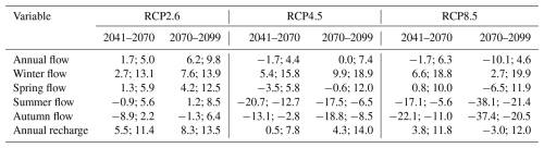 Figure 9Changes in the annual groundwater recharge and the annual, winter and summer flows between the reference period and the end of the century for the four storylines. The areas coloured black on the maps are those where there is no aquifer and where the notion of groundwater recharge is not relevant. Median changes are shown for annual and seasonal flows based on available HMs (please note the different scales in Fig. 7).