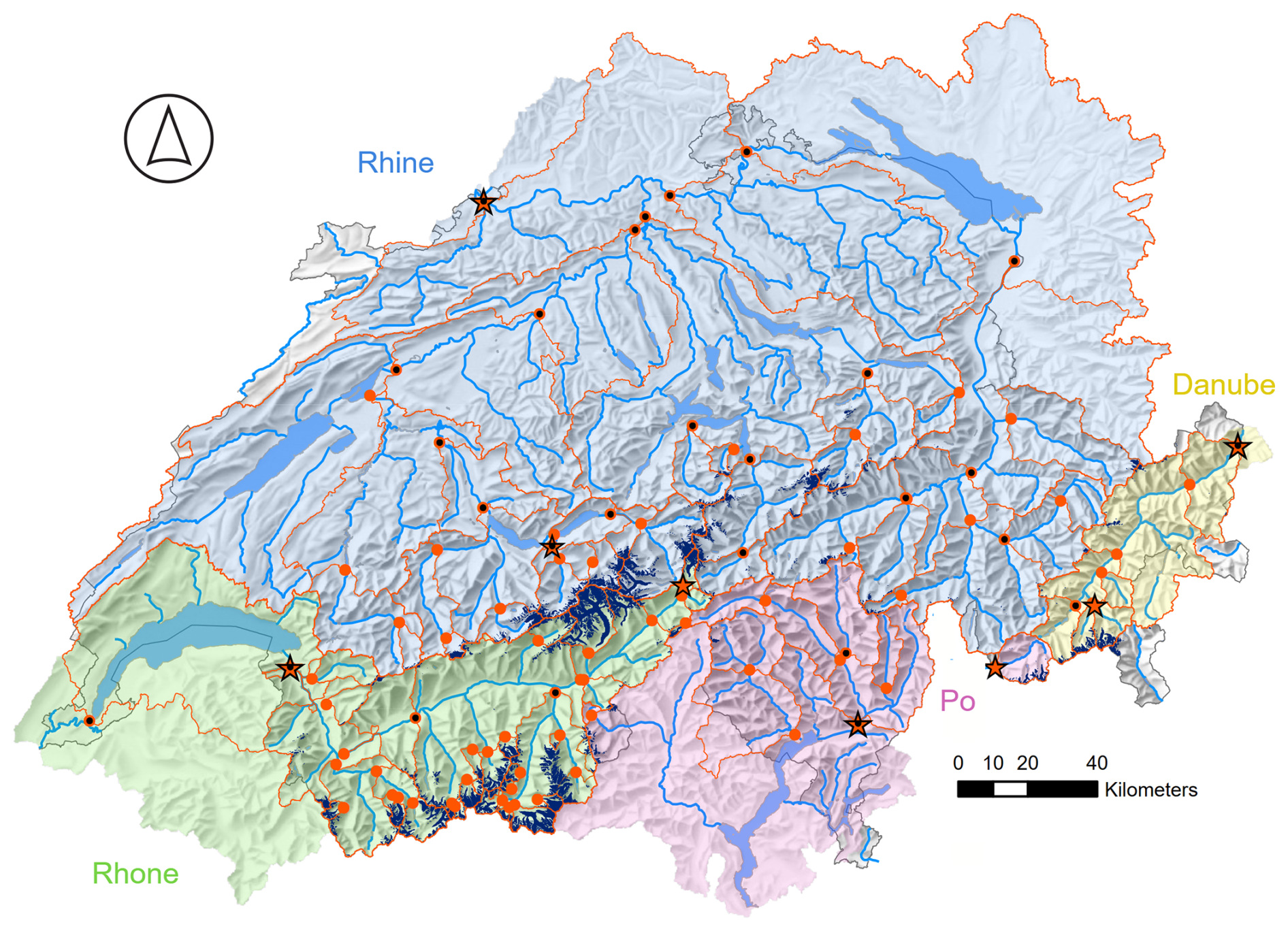 Figure 1Map of hydrological Switzerland with the 88 studied catchments and gauging stations (orange outlines and dots). The four main river basins are indicated with a different background color. Glacier outlines (dark blue) are from the Swiss Glacier Inventory 2016. Selected outlet stations for the main river basins (stars) and gauging stations with streamflow data starting before 1921 (black dots) are indicated.