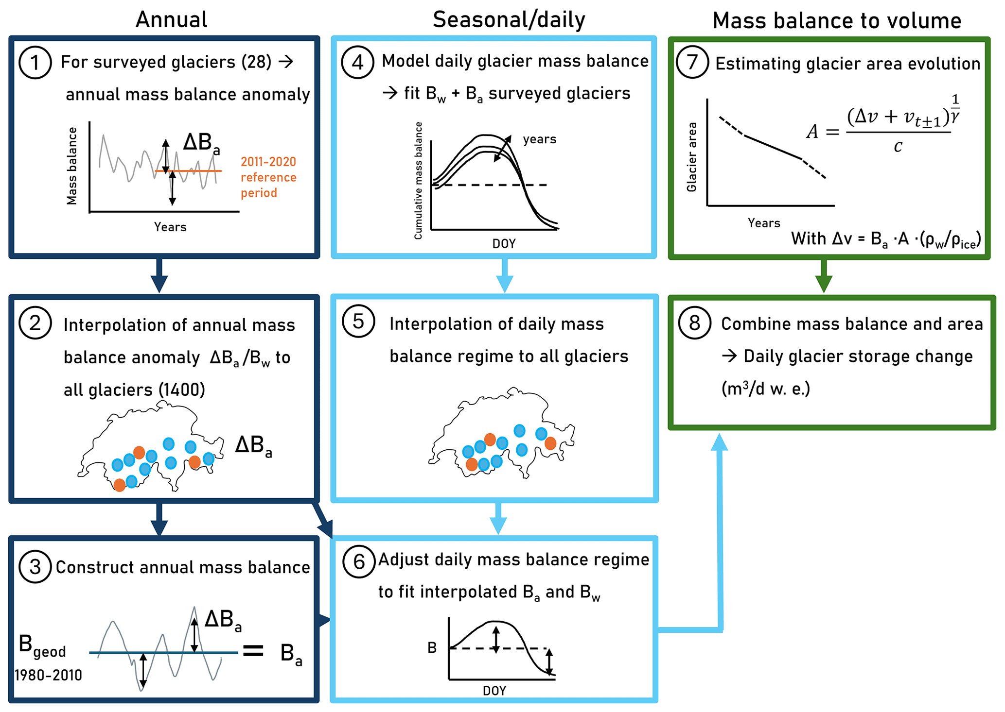 To analyze glacier mass changes and melt and assess their downstream contributions to streamflow in time and space, a new approach was developed. It estimates glacier mass change at the scale of all individual Swiss glaciers (1400 glaciers) at a daily time resolution. The approach is based on a combination of in-situ measurements, remote-sensing data and modelling, and consists of four main parts: (a) extrapolating seasonal and annual mass balance from surveyed glaciers in space for obtaining an observation-based year-to-year variability (steps 1–2 Fig. 2), (b) combining these with geodetic mass balances from the comparison of digital elevation models (DEMs) for obtaining information on long-term mass changes of all individual glaciers (step 3 Fig. 2), (c) extracting a seasonal daily glacier mass balance pattern from a daily glacier mass balance model constrained with these data sets (steps 4–6 Fig. 2), and (d) estimating glacier area evolution over time using area-volume scaling to convert specific mass balance into absolute glacier mass changes, or water volumes (steps 7–8 Fig. 2). A similar approach, including parts, a, b and d has recently been applied also at a global scale (Dussaillant et al., 2025).