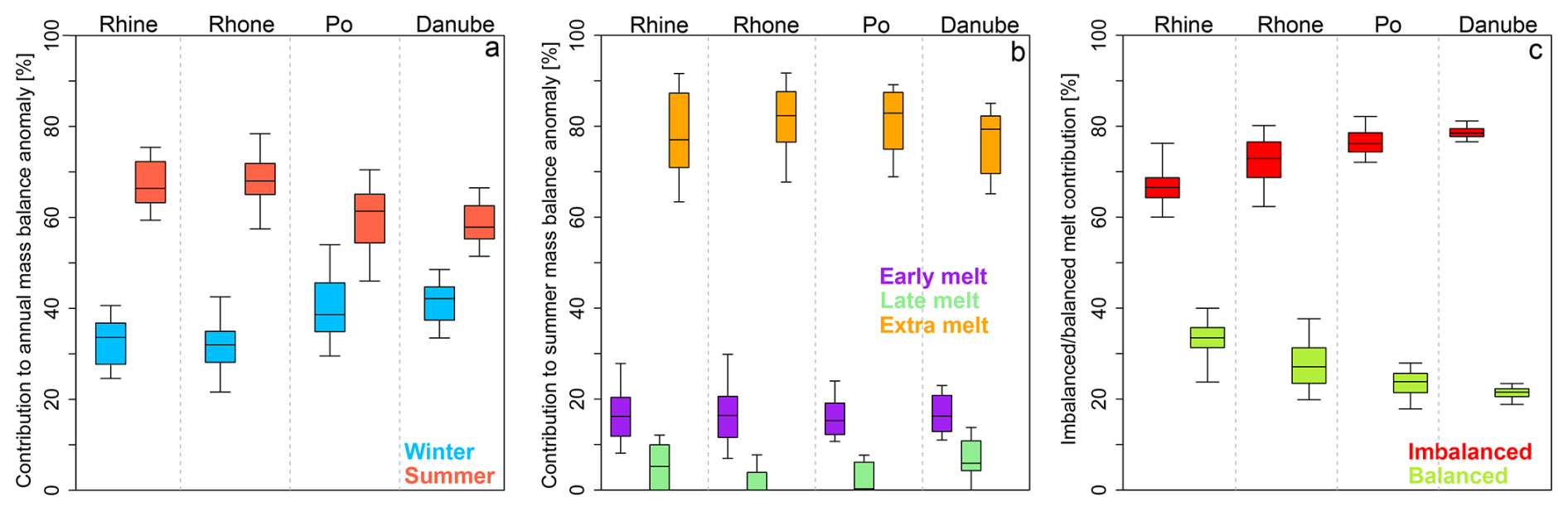 The anomalous summer mass balance and the generated summer melt volume could be attributed for 15 %–20 % to the early onset of the ablation period and for 75 %–85 % to the more intense melt over the summer period, with similar contributions of these two aspects across the glaciers in the different basins (Fig. 3b). The day of maximum cumulative daily mass balance (stratigraphic winter mass balance), was reached 1–3 weeks earlier in 2022 than in the reference period (not shown). The ablation season ended for approximately half of the glaciers (661/1400) not later than during the reference period. For the other half, the melt season of 2022 ended 1–4 weeks later than during the reference period. Compared to the other two processes, the prolongation of the ablation season into autumn contributed only marginally to the extra glacier melt in 2022 for some glaciers in the Rhine and Danube basins.