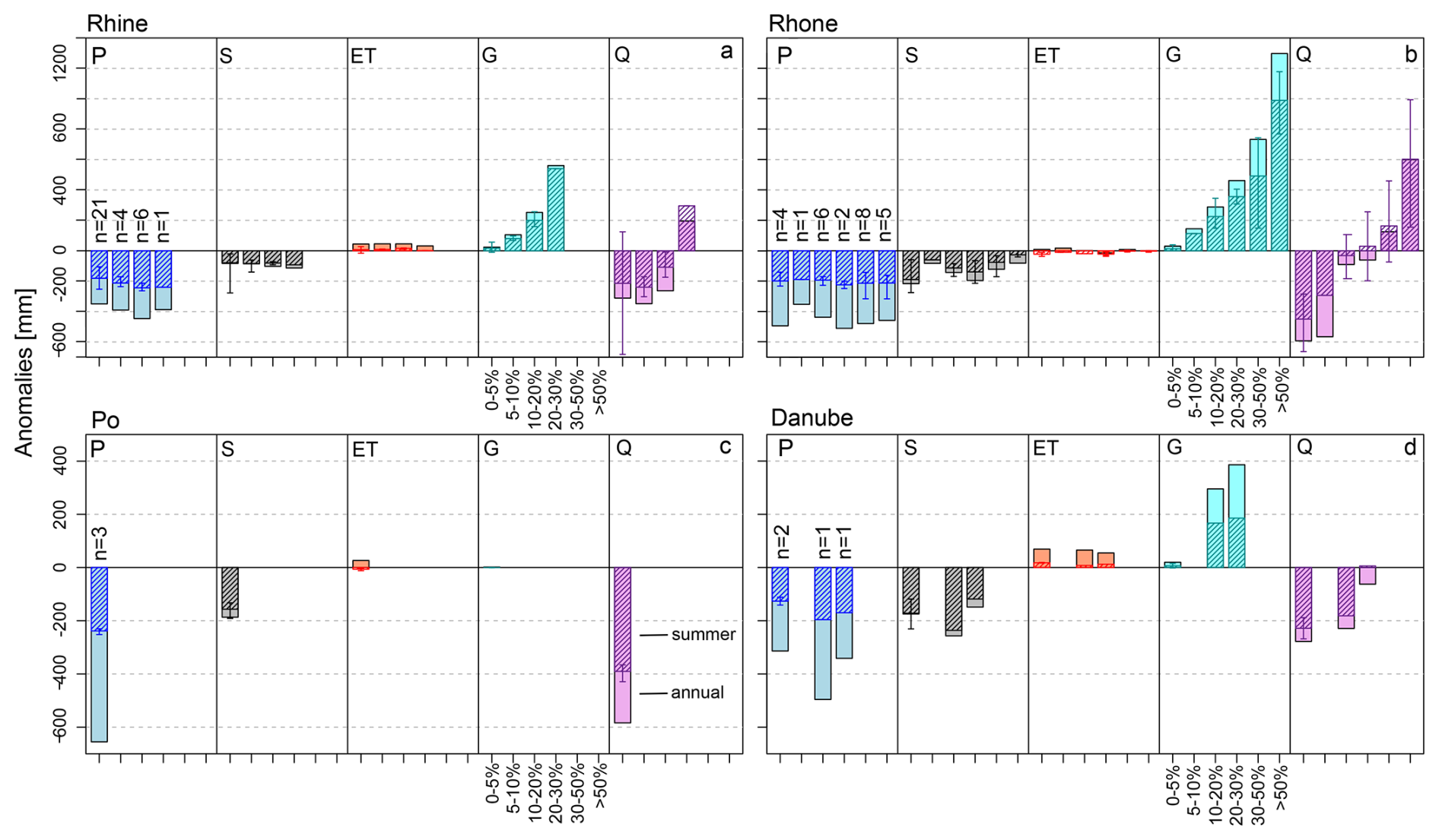 To explain the streamflow anomalies, we need to analyze the anomalies in the other water balance terms. Precipitation and the glacier net storage change (variable “P” and “G” in Fig. 4) anomalies are the largest in magnitude, but with opposite signs. For snowmelt (variable “S” in Fig. 4), only the non-glacierized area was considered and therefore the absolute anomalies are smaller, especially for catchments with high glacierization. During summer, the lack of precipitation (rainfall) and the snowmelt deficit of the non-glacierized area contributed approximately equally to the water deficit for most catchments. The surplus glacier net storage change counterbalanced the deficits in rainfall and snowmelt. The glacier net storage change anomalies were larger at the annual scale than for the summer, especially in the Rhone and Danube basin. This difference is opposite to the absolute glacier net storage change value (not the anomaly), which is larger in summer (mostly ablation) than over the year (net effect of accumulation and ablation). The lack of snow, in addition to the high melt, caused these larger anomalies at the annual scale than for the summer. The catchment scale net glacier storage change anomalies (surpluses) increase with increasing glacierization. The smallest anomaly term, both absolute and relative, is the evapotranspiration anomaly (variable “ET” in Fig. 4). For catchments in the Rhone basin the ET anomaly was negative, as opposed to the other catchments, indicating a water-limited situation in this part of Switzerland.