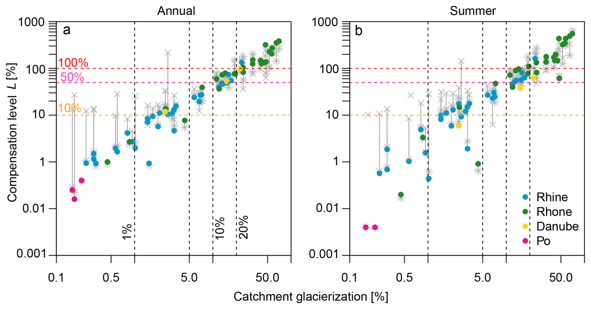 The large glacier melt anomalies of 2022 could (partly) compensate for the lack of precipitation and snowmelt, as well as for the extra evapotranspiration. The degree of this compensation depends on the level of glacierization (Fig. 5). At the annual scale, in catchments with around 25 % glacierization the extra glacier melt could fully compensate the deficits in the other water balance terms (L=100 %), while in summer this full compensation already occurs for catchments with 15 %–20 % glacier coverage (Fig. 5). For catchments with higher glacierizations, resulting in L>100 %, the excess glacier melt overcompensated the negative anomalies in precipitation, snowmelt and evapotranspiration, leading to positive anomalies in streamflow. A 50 % compensation of the water deficits occurred for catchments with a glacierization of 15 %–20 % (10 %–15 %) at the annual (summer) level. Even for catchments with only a few percent glacier cover (1 %–5 %), the extra glacier melt could still alleviate the impact of the deficits by around 10 %. The addition of the water balance anomaly rest term ϵ (difference between the ΔQ and the sum of ΔP, ΔS, Δ ET and ΔG) leads mostly to a higher compensation level for catchments with low glacierization, and vice versa. This may suggest that water transfers from the highly glacierized catchments to other regions, included in the larger low glacierized catchments play an additional role in the catchment compensation processes. Alternatively, uncertainties in water balance anomalies may differ up- to downstream.