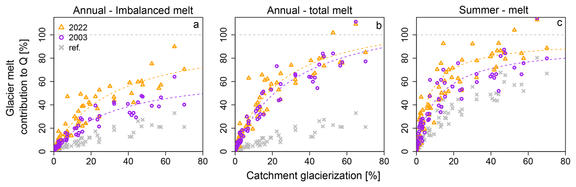 Figure 6Glacier storage change contribution to streamflow in 2022, 2003 and during the reference period (1991–2020) for imbalance melt at the annual scale (a), for total melt at the annual scale (b) and for melt during summer (MJJA) (c). The dashed line shows an exponential fit between catchment glacierization and glacier melt contribution to streamflow.