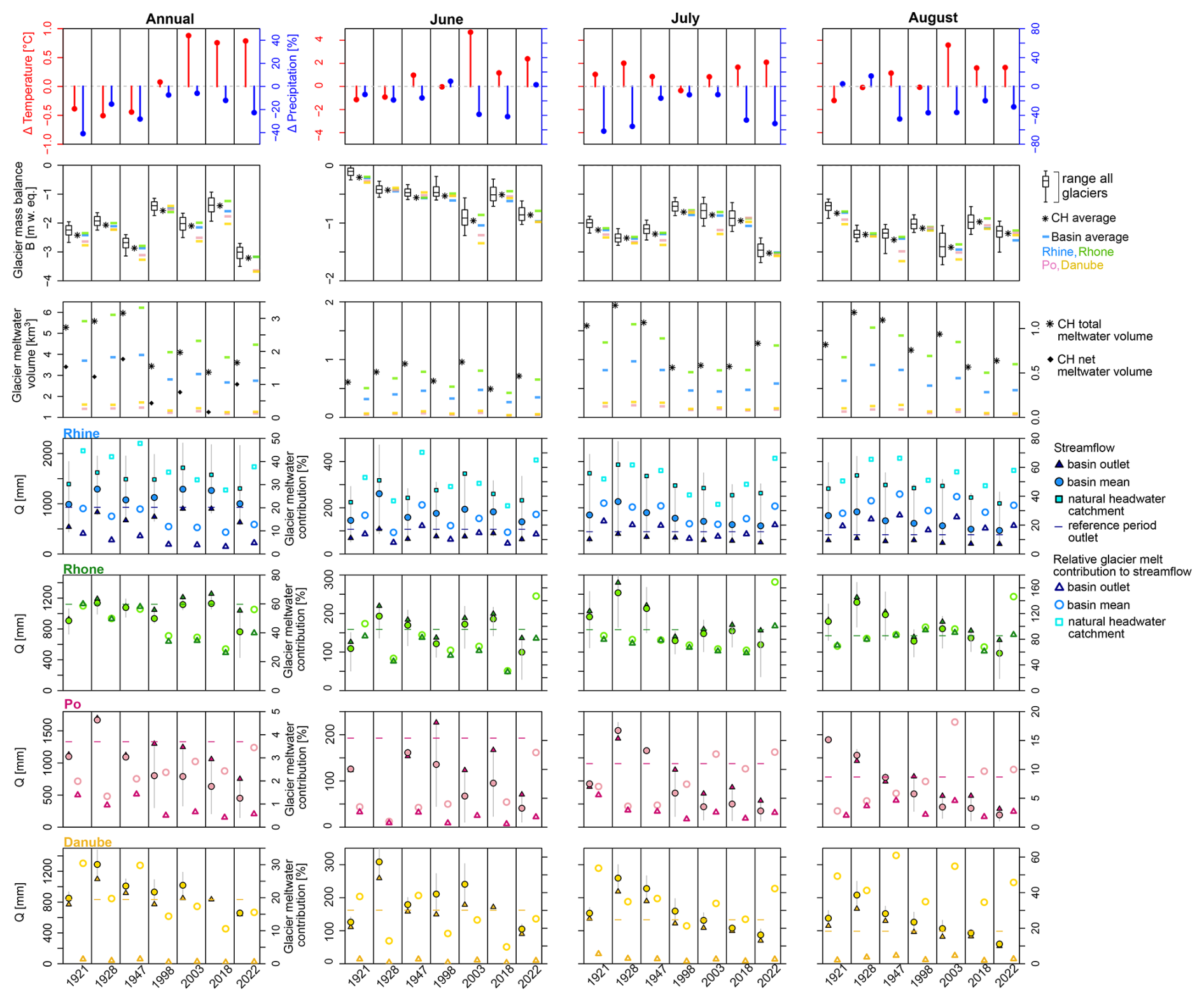 Figure 7Comparison of meteorological, glaciological and hydrological conditions for glacio-hydrological extreme years (1921, 1928, 1947, 1998, 2003, 2018, 2022). The columns indicate different aggregation periods: annual and monthly (June, July, August), while the rows indicate different variables: temperature and precipitation anomalies (row 1), glacier specific mass balance (row 2), glacier meltwater volumes (row 3), streamflow (row 4–7), relative glacier meltwater contributions to streamflow (row 4–7). In each panel, the columns refer to the different extreme years. Note the double y-axes for row 3–7. The right y-axes in row 3 refers to the basin volumes, whereas the left y-axis refers to the Swiss-wide volumes.