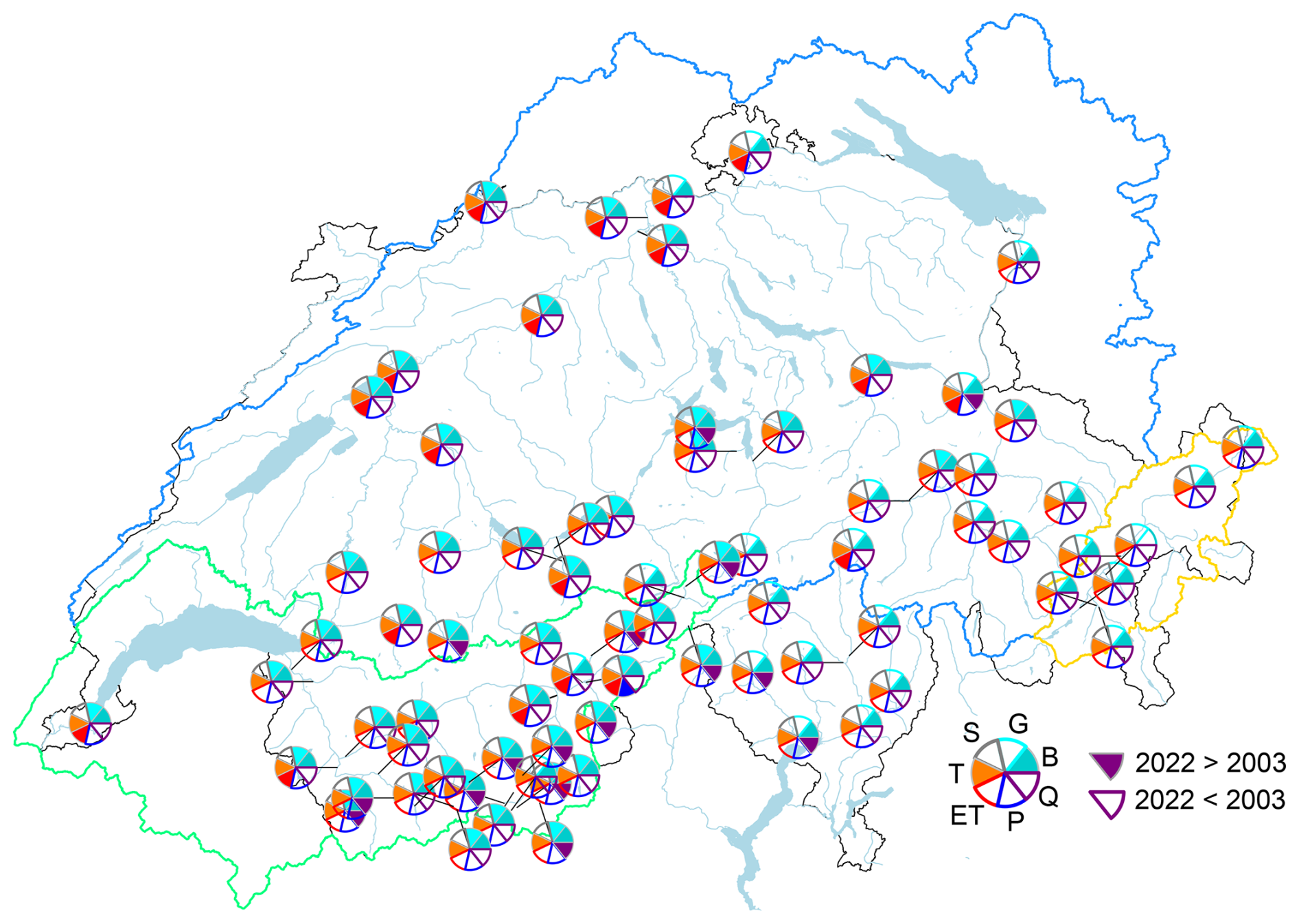 For the attribution of the 2022 streamflow anomalies (ΔQ), we analyzed anomalies in precipitation (ΔP), snowmelt (ΔS), ET (Δ ET), and glacier storage change (ΔG). For each of these water balance components, annual (hydrological year) and summer (MJJA) anomalies were derived. May was included since in 2022 this month experienced high snow melt rates already. The anomalies were generally calculated using the reference period 1991–2020. However, due to insufficient data, Δ SWE was calculated using 1999–2020 across all catchments, while ΔQ was calculated for seven catchments using reference periods starting between 1994 and 2012. For ΔG, the sum of all storage change values (positive and negative values) were used.
