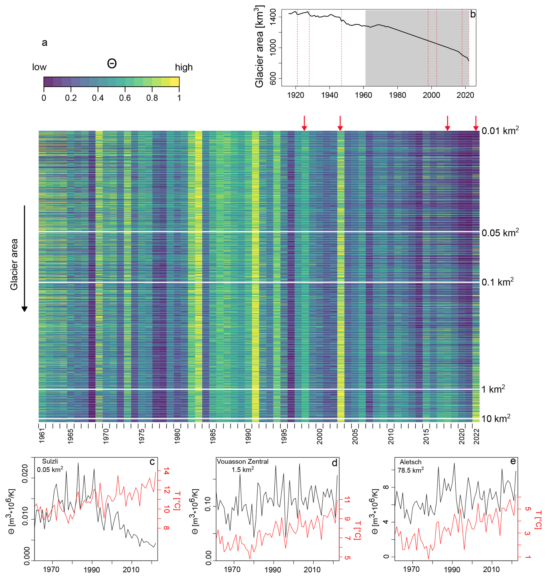 Figure 9Time series of normalized glacier melt sensitivity (Θ) for each glacier and the period 1961–2022, sorted by glacier area (a). The red arrows indicate the extreme years 1998, 2003, 2018 and 2022. Panel (b) shows the evolution of the total glacier area in Switzerland over time, with in gray the period covered by the sensitivity metric of panel (a). Panels (c)–(e) show examples of individual glaciers with Θ in black and temperature in red, with Sulzli glacier located in the eastern part of the Rhine basin, Vouasson glacier in the southern part of the Rhone basin and Aletsch in the northeastern part of the Rhone basin.