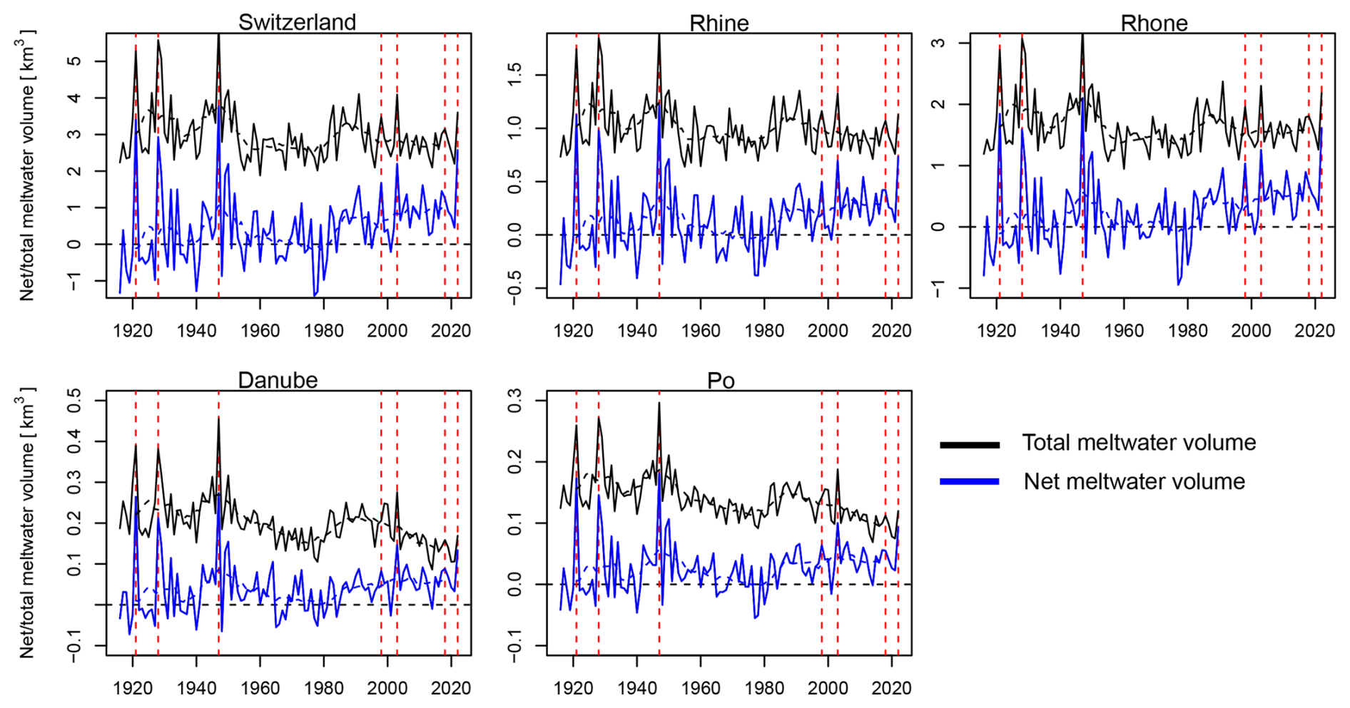 Figure 10Evolution of annual meltwater volumes from 1916–2022 aggregated for Switzerland and the four main basins Rhine, Rhone, Danube and Po. The lines depict net meltwater volumes (annual glacier mass loss) and total meltwater volumes (absolute value of sum of all negative storage changes), with the 11y moving average as dashed line. Negative net meltwater volumes indicate mass gain of the glaciers. Vertical dashed lines indicate the selected extreme years.