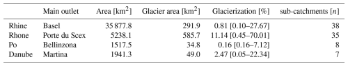 We consider all gauged glacierized catchments in Switzerland for which reliable data could be obtained through the federal network, the cantonal stations and private companies (Fig. 1). In total, 88 catchments are included, with sizes varying from 9 to 35 877 km2 (Table S1 in the Supplement). These catchments contain 97 % of the 1400 Swiss glaciers (Linsbauer et al., 2021) and are sub-catchments of the four main river basins Rhine, Rhone, Po and Danube (Table 1). A small part of the alpine Rhine basin is located outside the Swiss borders and the glaciers in this part are therefore not included in the analyses (0.3 % of the glacier area of the Rhine basin). These four main river basins experience varying climates, with the Rhone and Danube basins being drier, and the Po basin generally wetter, compared to the Rhine basin.