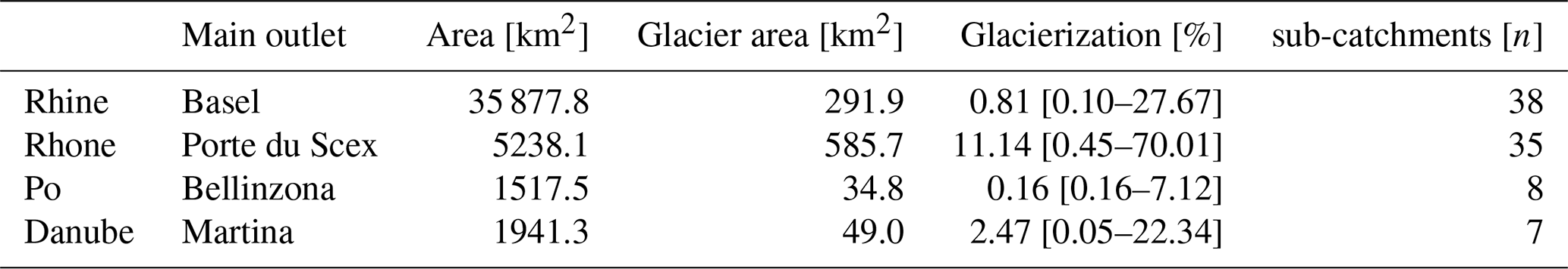 Table 1Characteristics of the four main studied basins in Switzerland, with the number of studied sub-catchments indicated in the last column. The Glacierization column refers to relative glacier cover for the chosen outlets in column 2, with in brackets the range for the sub-catchments. Glacier data refer to the Swiss Glacier Inventory 2016.