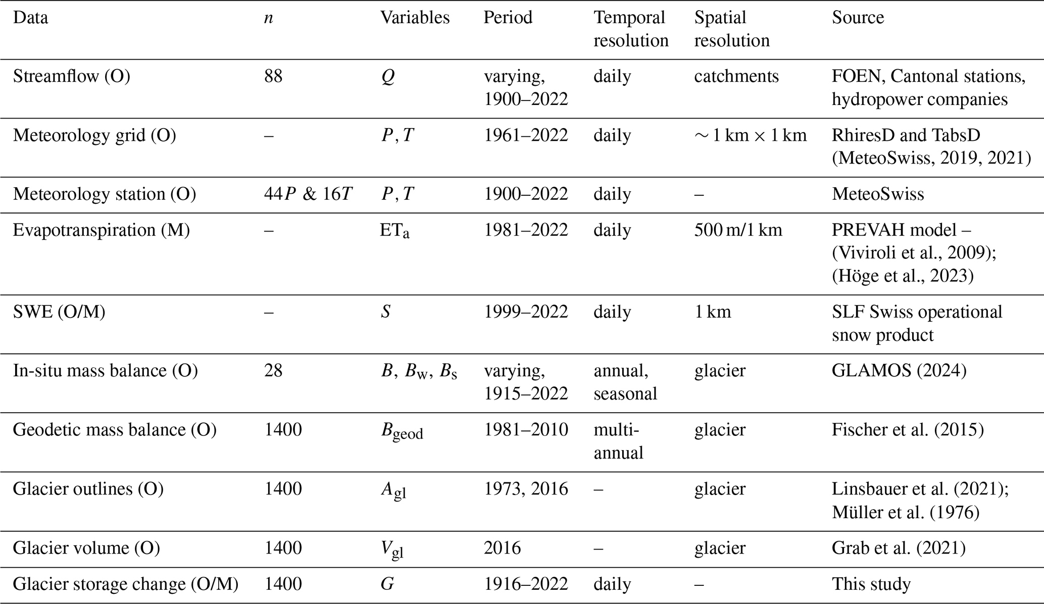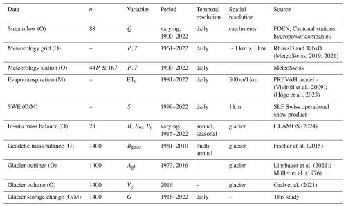 (MeteoSwiss, 2019, 2021)(Viviroli et al., 2009)(Höge et al., 2023)GLAMOS (2024)Fischer et al. (2015)Linsbauer et al. (2021)Müller et al. (1976)Grab et al. (2021)Table 2Overview of the datasets used in the study. (O) and (M) in the “Data” column refers to Observations, or Modelled, respectively. P stands for precipitation, T for temperature, SWE for Snow Water Equivalent. The “n” column indicates the number of catchments/glaciers for which data was available in this study.
