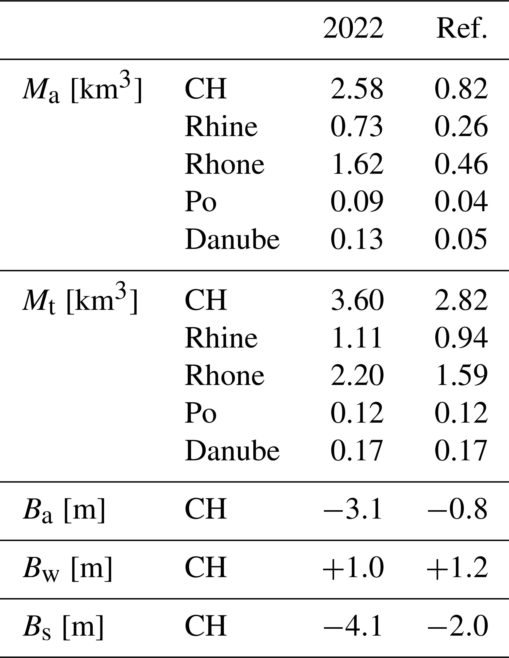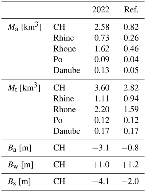 Table 3Glacier meltwater volumes and mass balances for 2022 and the reference period (1991–2020). M refers to meltwater volumes, whereas B refers to glacier-wide mean specific mass balance. “a” refers to net annual, “s” to summer, “w” to winter and “t” to total. CH/Basin refers to Swiss-wide/Basin average or sum. The numbers refer to the mass balance year corresponding to the hydrological year; used in most of the comparisons and analyses. Table S3 shows the results for the stratigraphic mass balance, used in the glacier attribution analyses.