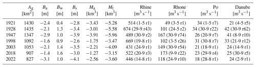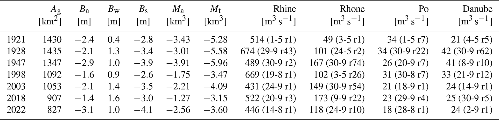 Table 4Glaciological and hydrological characteristics of selected extreme years, referring to the hydrological year (October–September). Ag is the glacier area, Ba, Bw and Bs the annual, winter and summer mass balances (m w.e.), respectively, for the fixed system. Ma is the corresponding net meltwater volume and Mt the total meltwater volume (km3 w.e.), taken as the sum of all daily negative storage changes. The last four columns indicate the 7 d average lowest flow (NMQ7) at the outlet of the four main basins (Fig. 1), with in brackets the date of occurrence (d-m) and the rank for that day (rx).