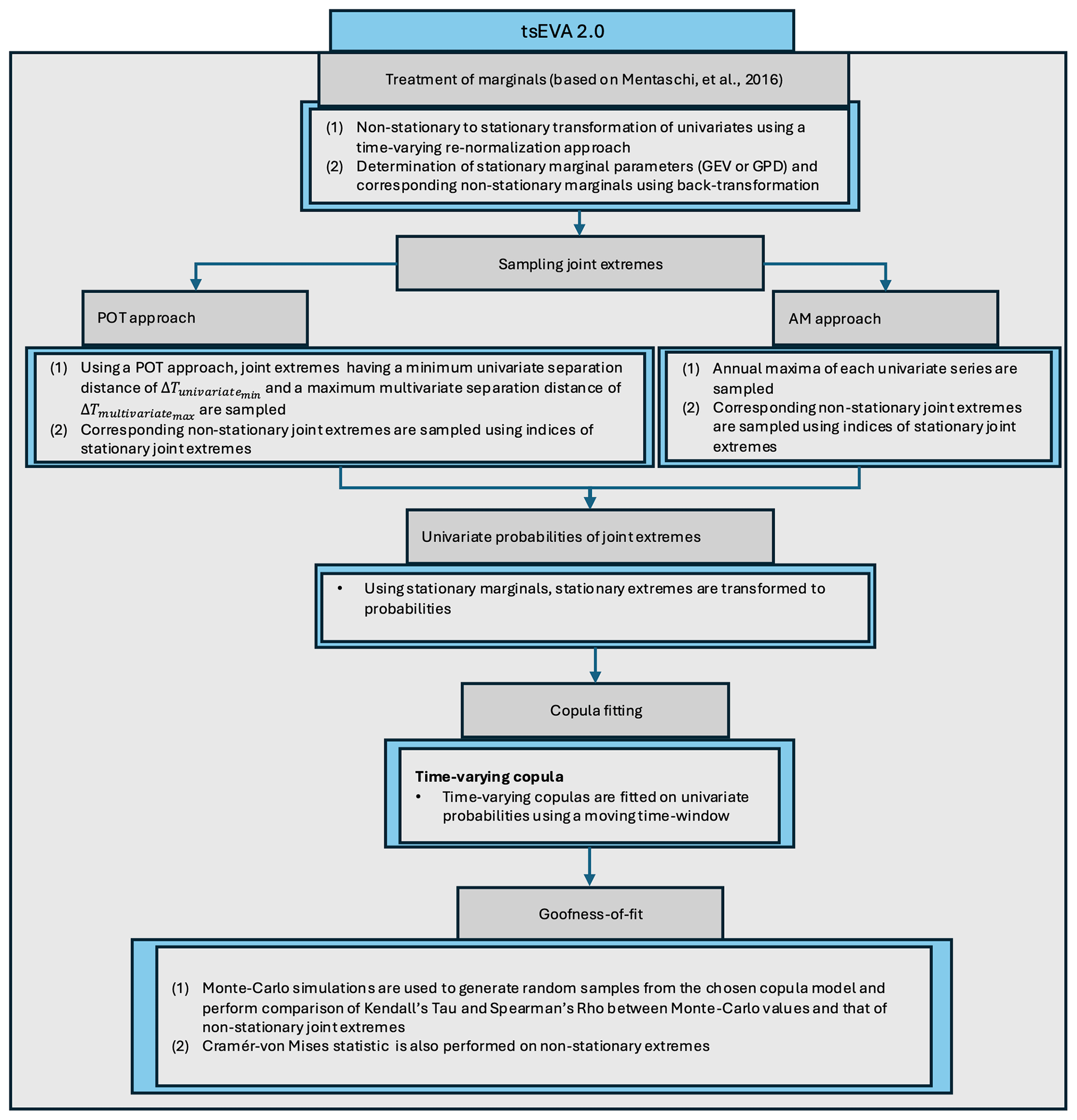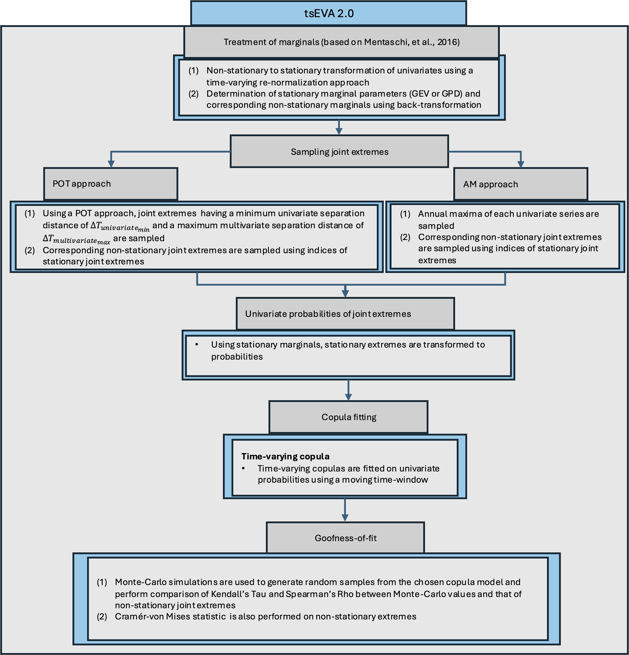 In both approaches, the analysis begins by applying tsEVA's method to transform each univariate time series from non-stationary to stationary. The extreme value distribution (either GPD or GEV) is then fitted to the stationary series, and the resulting distributions are back-transformed into the time-varying domain to represent the non-stationary marginals. Joint extremes are subsequently sampled and mapped into probability space using the stationary marginals. A copula is then fitted to this transformed dataset, which can either be stationary (assuming constant dependency over time) or non-stationary (accounting for time-varying dependency). To ensure the appropriateness of each copula model in representing the joint distribution of non-stationary extremes, we developed a dedicated goodness-of-fit routine. A flowchart of tsEVA 2.0 is presented in Fig. 1.