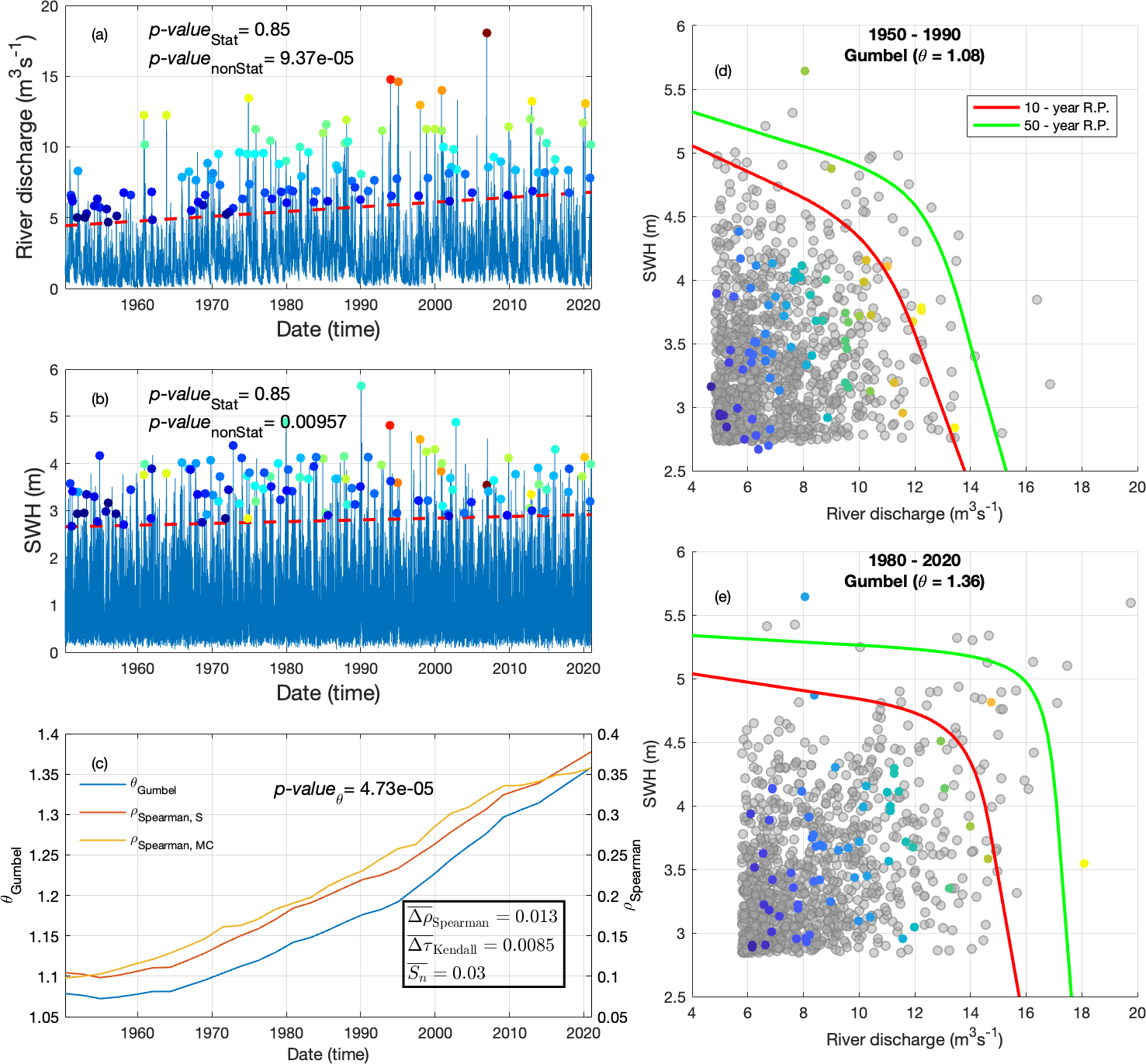 Figure 2Analysis of joint extremes of river discharge and wave height off La Liane river mouth. In panels (a) and (b) the input series are presented (blue line). The thick dashed red line is the time-varying threshold level while the colored dots indicate the joint extreme events. The color of dots was based on events having the largest mean value. Also shown in these two plots is the p-value of Mann-Kendall test of the percentile series applied on both stationary (denoted by Stat) and non-stationary (denoted by nonStat) series. Variation with time of the copula parameter was depicted in panel (c) with a p-value of Mann-Kendall test. Other goodness-of-fit parameters of the non-stationary copula model were shown in panel (c). A 10-window smoothing was applied to curves of panel (c) for better representation. The time-varying Spearman correlation coefficient of the samples (red line) and Monte-Carlo values (yellow line) were also presented in panel (c). Panels (d) and (e) present the overlay of joint extremes (colored dots) and Monte-Carlo values (gray dots) in two different time windows (1950–1990) of (1980–2020) with the copula parameter indicated above. The 10 and 50-year joint return levels (using the AND definition) are also shown in these panels (colored curves).