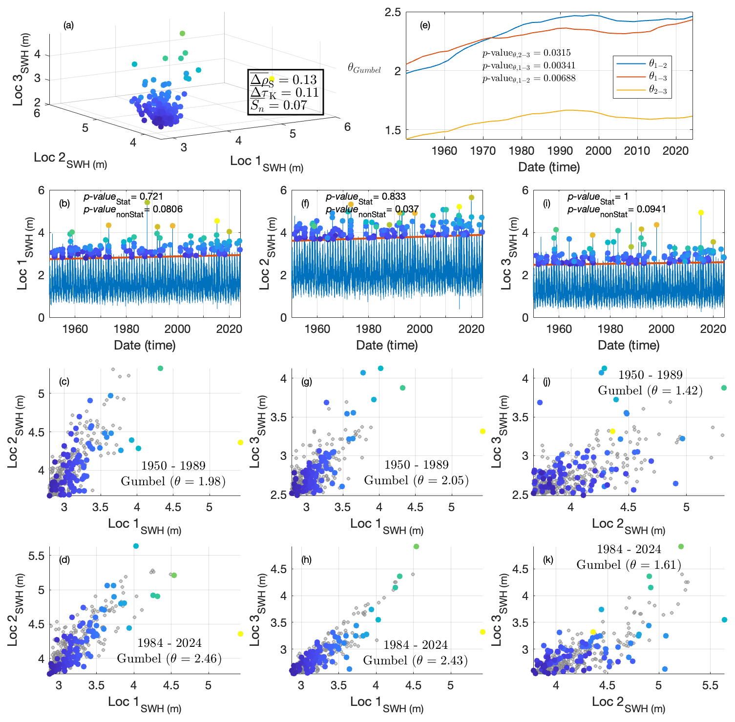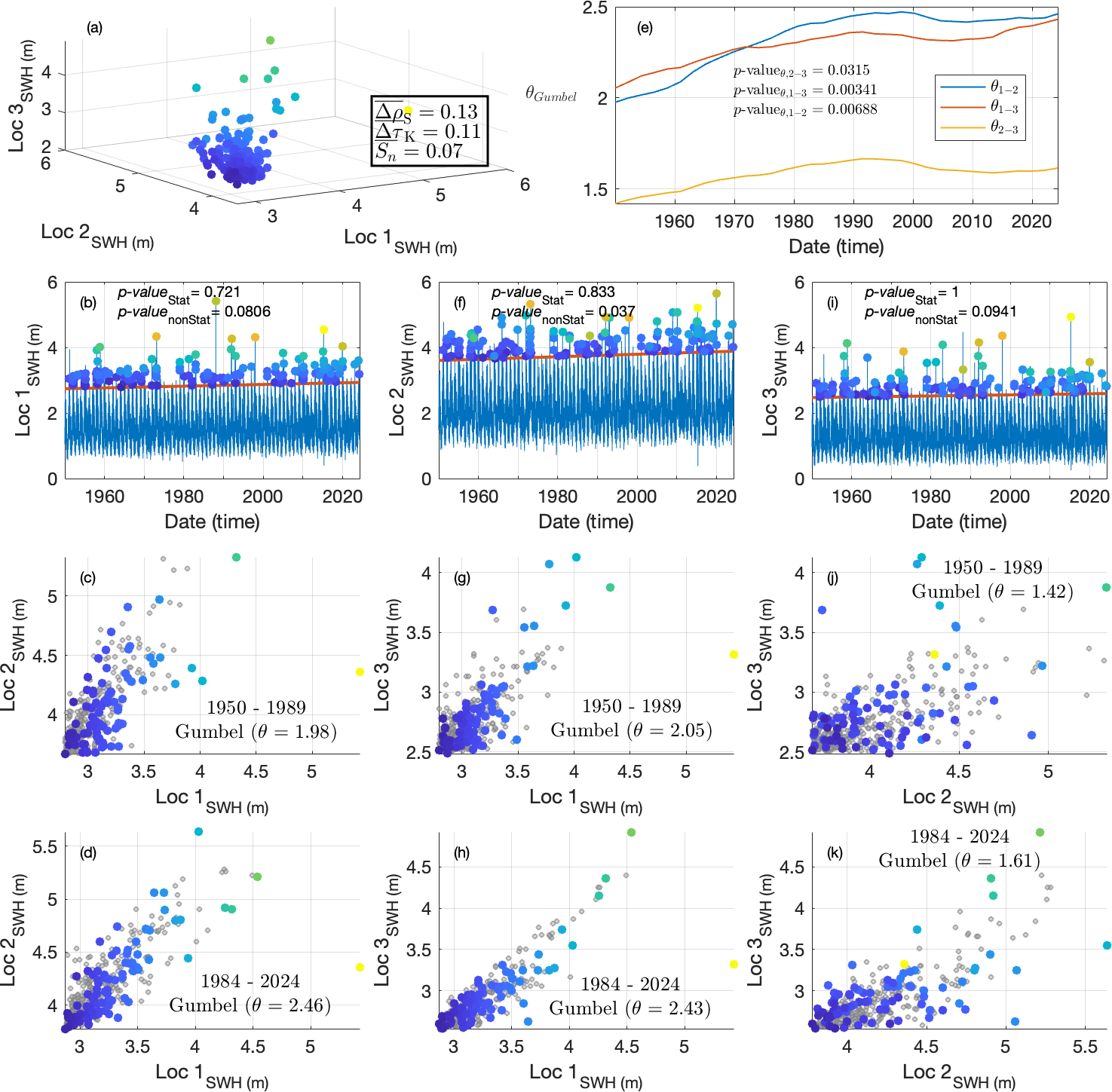 Figure 3Analysis of trivariate extremes of SWH in neighboring locations near Marshall Islands. Goodness-of-fit parameters and sampled extremes are presented in panel (a). Univariate extremes (colored dots) and threshold levels (thick red lines) along with the p-value of the Mann-Kendall test of the percentile series applied on both stationary (denoted by Stat) and non-stationary (denoted by nonStat) series are presented in panels (b), (f) and (i). Panels (c), (d), (g), (j), (k) and (i) present overlaying of pairs of extremes (colored dots) and Monte-Carlo values (gray dots) with the copula parameter and time window indicated above each panel. The time-varying coupling parameter of each pair of extremes and the p-value of the Mann-Kendall test of the coupling parameter is presented in panel (e). A 10-window smoothing was applied to curves of panel (e).