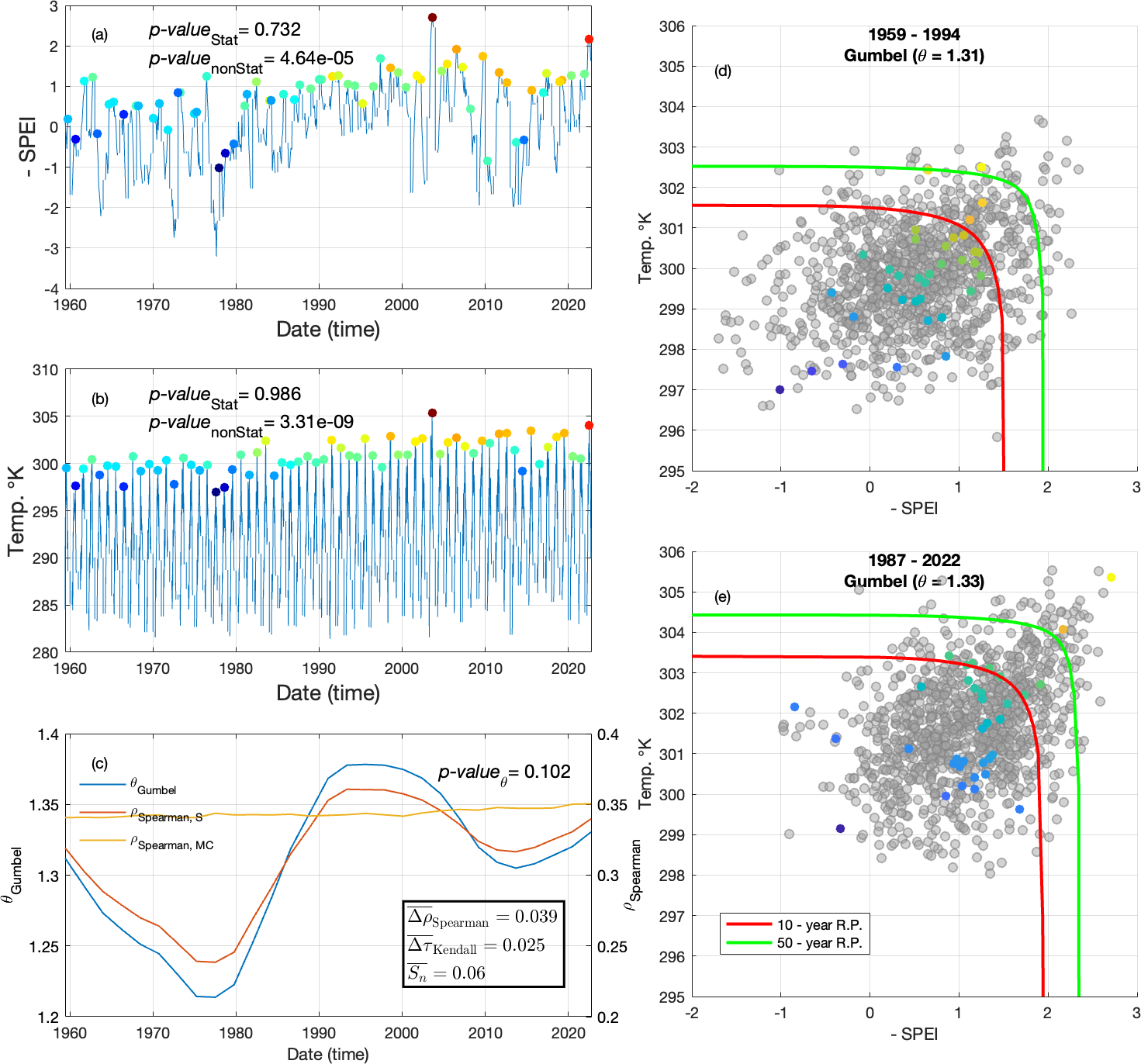 Figure 4Analysis of annual extremes of SPEI and temperature (° C). Panels (a) and (b) display the input series (thin blue line) alongside the annual maxima (colored dots), where SPEI values have been multiplied by −1 for interpretability. The color of the dots reflects the mean values of the joint extremes. The p-value from the Mann-Kendall test applied on both stationary (denoted by Stat) and non-stationary (denoted by nonStat) series for the annual maxima is also reported in these panels. Panel (c) presents the goodness-of-fit parameters for the copula model, along with the time-varying coupling parameter (left axis) (thick blue line) and the time-varying Spearman correlation coefficient, calculated for both the original samples and the Monte Carlo values (right axis). A 10-window smoothing was applied to curves of panel (c) for better representation. Panels (d) and (e) overlay the joint extremes (colored dots) with Monte Carlo values (gray dots), simulated based on the constant coupling parameter specified in each panel. The level of agreement between the observed and simulated values demonstrates the validity of the fitted copula model. Also shown in these two panels is the joint return levels (using AND definition) corresponding with the 10 and 50-year return levels (colored curves).