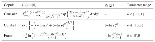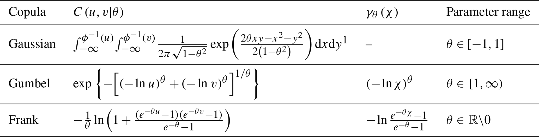Equation (1) illustrates why copulas are widely used in higher-dimensional statistics, as they enable separate modeling of the marginals and their dependency structure, simplifying the construction of joint distributions. For a more detailed description of the copula theory, the reader is referred to Joe (1997) and Nelsen (2006). In this study we considered three well-established types of copulas (Table 1):