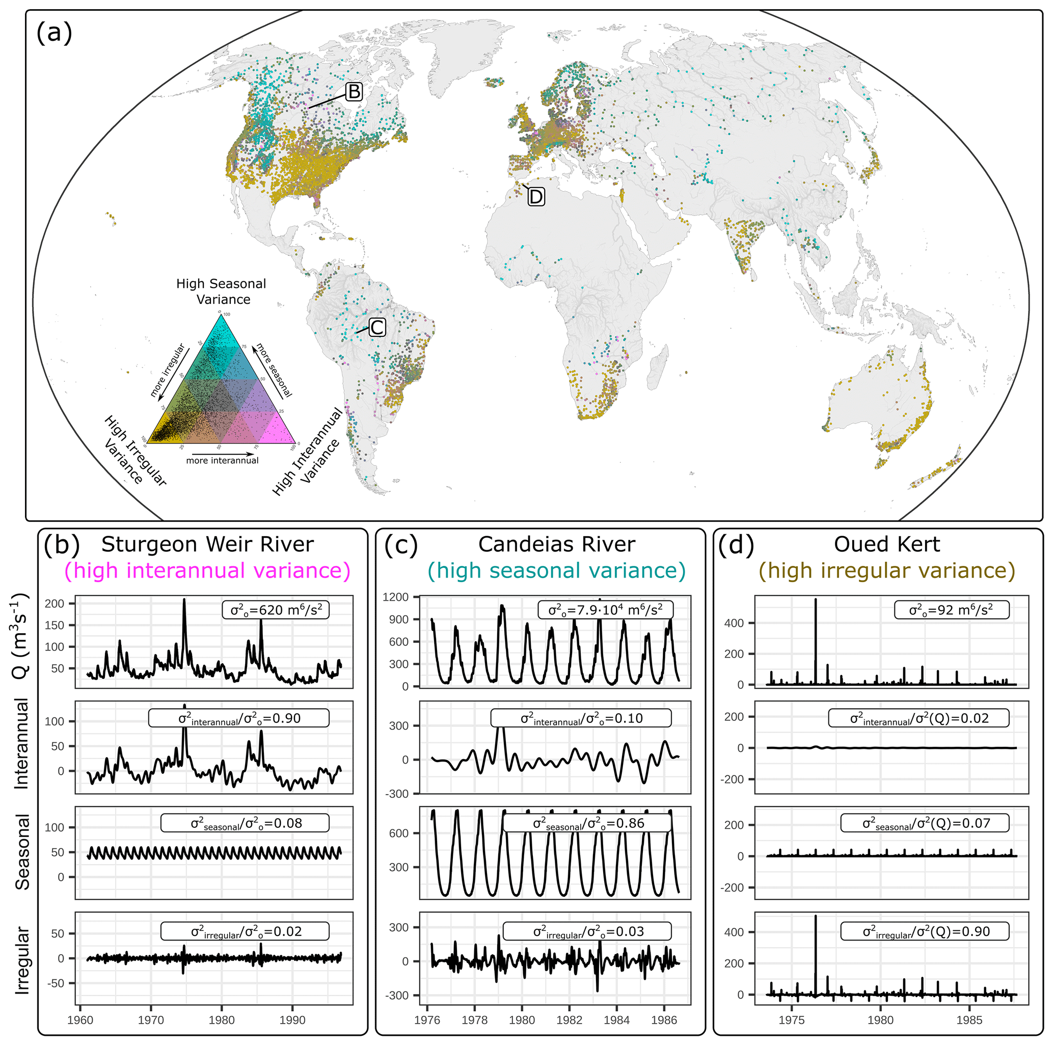 Figure 1(a) The fraction of variance that is seasonal, interannual, and irregular. To reduce overplotting, gauges have been aggregated to 1 per 2500 km2 using the mean of each variance fraction. (b)(d) show the decomposed time series for three example rivers that exhibit high variance fractions for each of the three components. (b) The Sturgeon Weir River at the outlet of Amisk Lake (Water Survey of Canada ID 05KG002, catchment area 14 600 km2), an interannually variable stream (90 % interannual variance). (c) Santa Isabel (Candeias River at Candeias do Jamari, Agência Nacional de Águas e Saneamento Básico ID 15550000, catchment area 12 700 km2), a highly seasonal stream (86 % seasonal variance). (d) Oued Kert at Driouch, an ephemeral stream in Morocco (Global Runoff Data Centre ID 1304800, catchment area 1353 km2), where 90 % of the variance is irregular. The mapped river network is derived from HydroRIVERS v1.0 (Lehner and Grill, 2013).