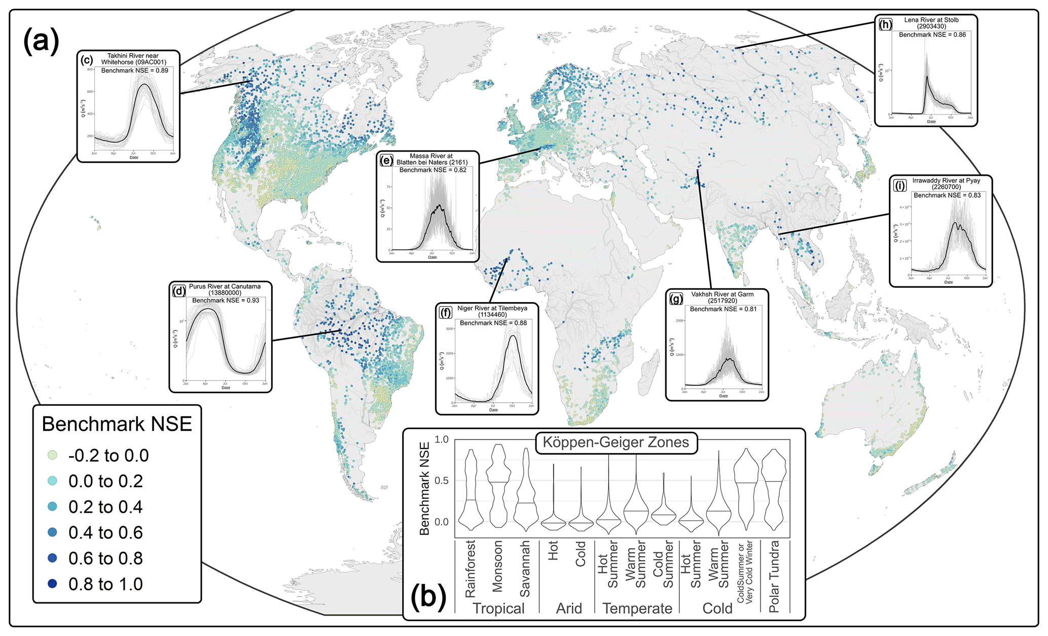 Figure 2(a) Climatological benchmark Nash–Sutcliffe Efficiencies for 20 338 catchments. To reduce overplotting, for panel (a) gauges have been aggregated to 1 per 2500 km2 using the median NSE. (b) Distribution of the climatological benchmark NSE by Köppen–Geiger climate zone. Cold (high alpine and polar) and tropical climates have high benchmark NSE values, often upwards of 0.5 and occasionally upwards of 0.8. (c–i) Annual hydrographs from catchments with very high benchmarks (BNSE > 0.8). The grey lines are individual years and the solid black line is the mean flow for each calendar day. The mapped river network is derived from HydroRIVERS v1.0 (Lehner and Grill, 2013).