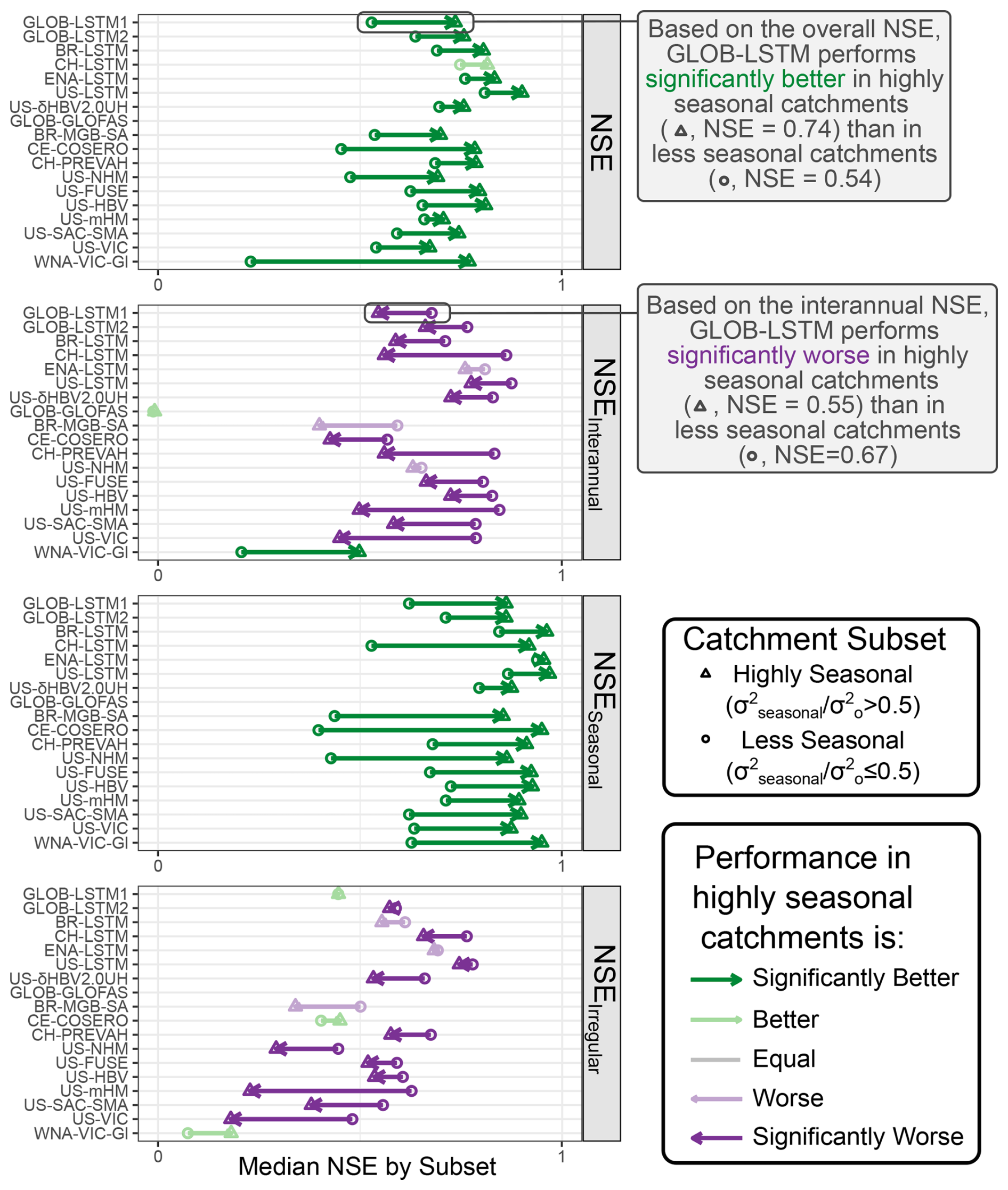 First, model optimization algorithms may bias training away from highly seasonal catchments. Seasonal variance is predictable and can be reproduced quite accurately with models of low complexity (Knoben, 2024). Where models are optimized simultaneously across many catchments, optimization algorithms may therefore greedily simulate the seasonal variance in seasonal catchments and neglect interannual and irregular variance. When seasonal variance is well-simulated, algorithms will prioritize improvements to modelling the irregular and interannual components in less-seasonal catchments where these improvements result in the largest increase to the average NSE. Learned human biases for what a “good” simulation looks like could also bias modellers to neglect catchments where errors appear small compared to the seasonal pattern, since expert opinions and current quantitative metrics have been shown to be mostly consistent (Gauch et al., 2023). However, six of the models that we analysed were calibrated individually to each catchment, so this explanation is not sufficient on its own.