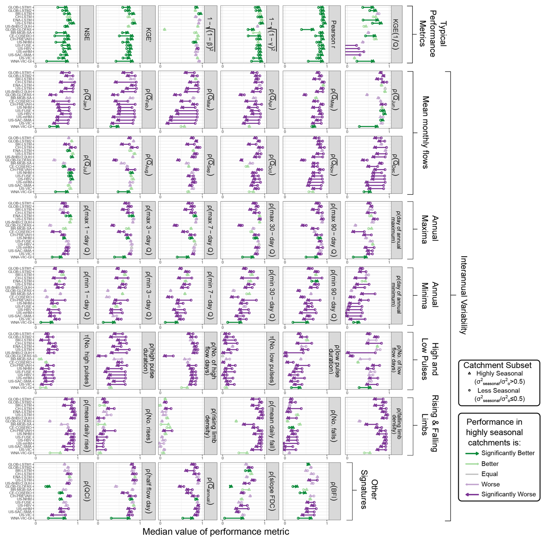 Figure 4 shows the expanded analysis for 6 typical performance metrics and 41 interannual signature metrics (see Table 1). The typical metrics (top row) are higher in highly seasonal catchments. NSE, KGE, Pearson r, and variance ratio γ are better in highly seasonal catchments across all 13 models, and most of these differences are statistically significant. KGE (1/Q) shows a similar pattern except for some of the process-based models for the United States, which struggle to simulate winter low flows in colder regions.