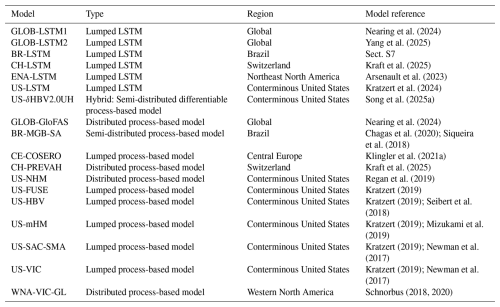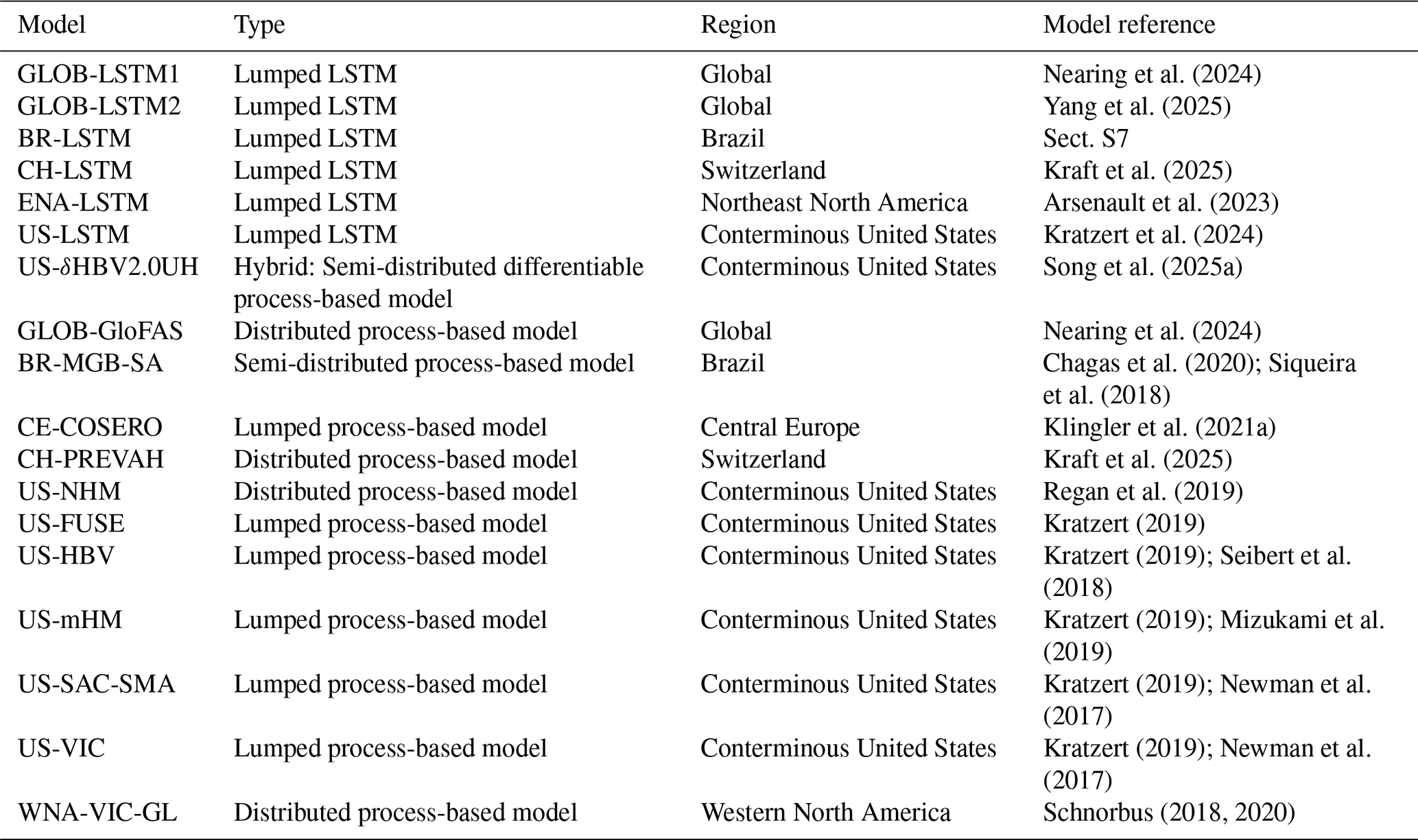In total we compiled simulations from 18 models this way: six Long Short-Term Memory Models (LSTMs), eleven process-based hydrologic models, and one hybrid model. These models are listed in Table 2, and Table S1 in the Supplement provides more extensive details about the calibration procedures for each model and the degree of human alteration of the catchments.