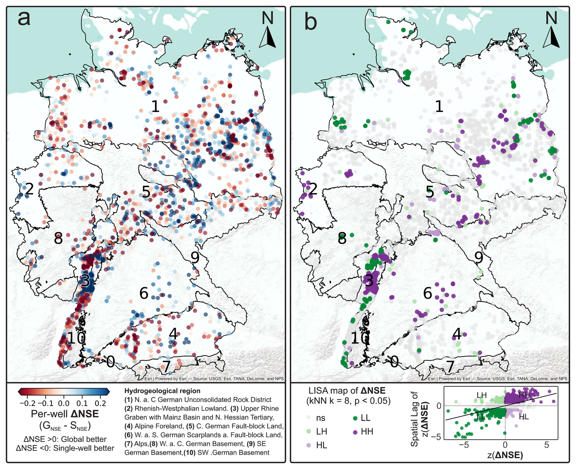 Figure 1Spatial patterns of per-well performance differences. Spatial patterns of per-well performance differences expressed as . (a) Pointwise map of ΔNSE across all wells (positive: global model performs better; negative: single-well model performs better). (b) Local Indicators of Spatial Association (LISA) map of ΔNSE based on a k-nearest-neighbor graph (k=8, row-standardized weights; p<0.05), highlighting significant High–High (HH), Low–Low (LL), High–Low (HL), and Low–High (LH) clusters; non-significant locations are marked as ns.