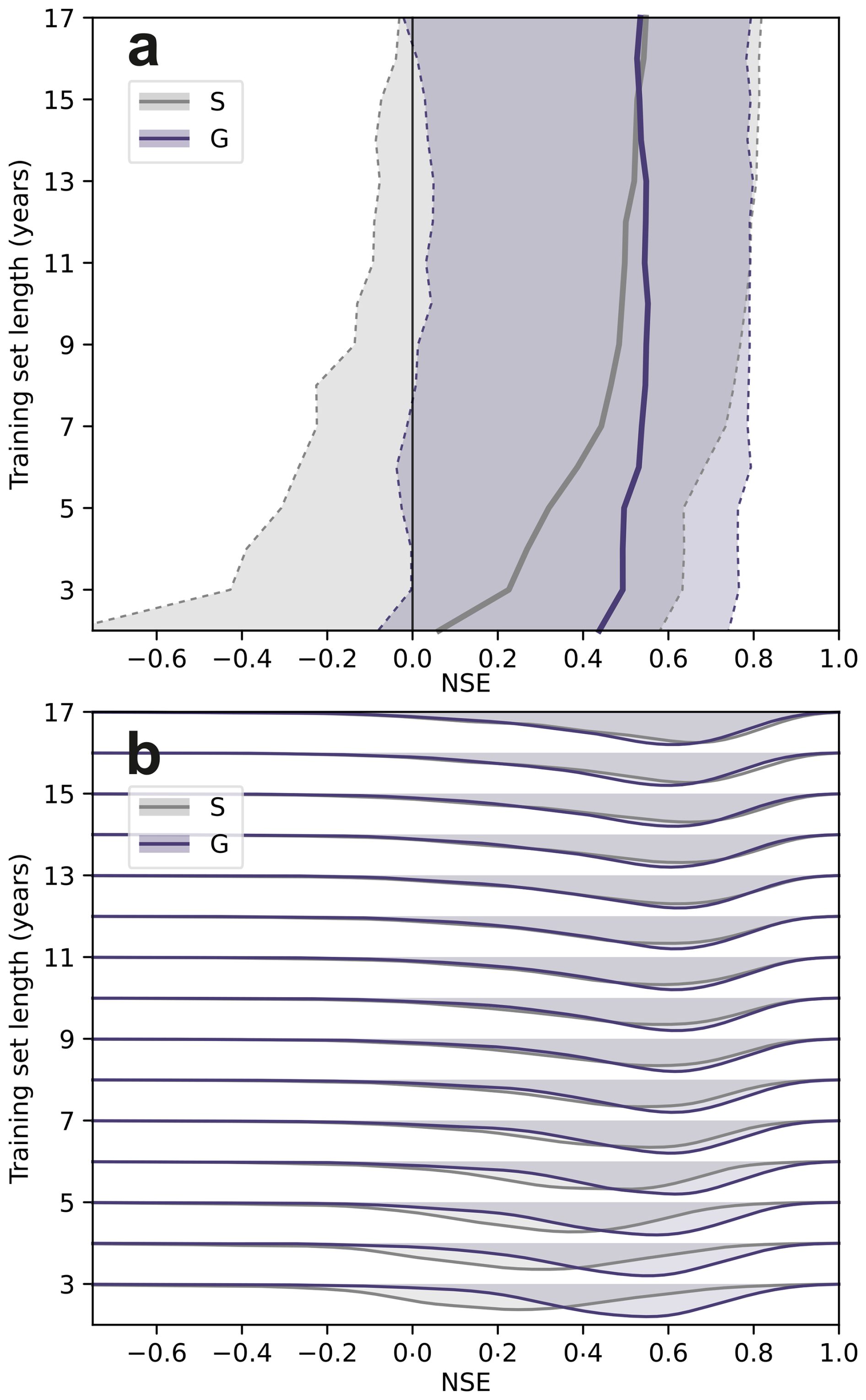 Figure 2Sensitivity to training-record length. Test-period NSE distributions for single-well (S) and global (G) models as a function of the available training-record length, obtained by progressively truncating the earliest training years in 1-year steps while keeping validation (2008–2012) and test (2013–2022) fixed. (a) Median NSE (solid line) and the 5th–95th percentile range across wells (shaded; dashed bounds); the vertical line marks NSE = 0. (b) Corresponding NSE distributions for each training length shown as overlapping ridgeline density estimates (per-length normalized for visual comparability).