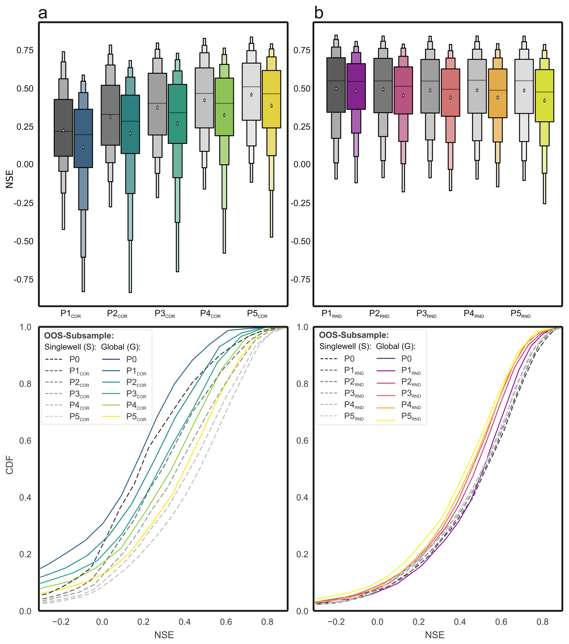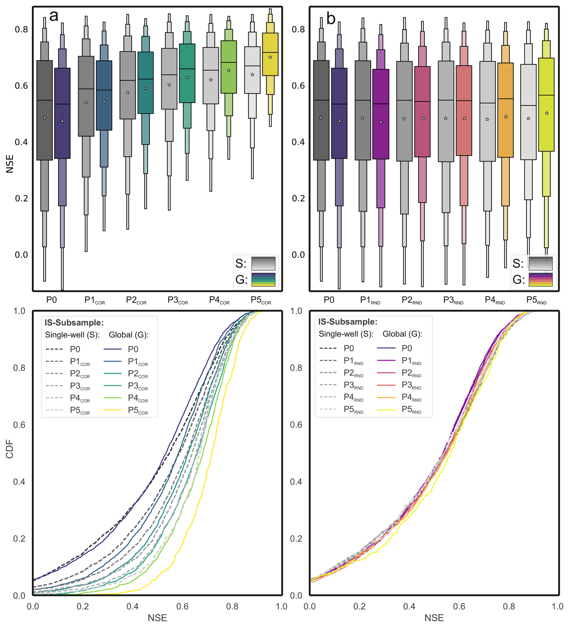 Figure 3Comparison of single-well and global model performance across generalization stages. (a, b) Distributions of NSE scores (top) and cumulative distribution functions (bottom) for single-well (S) and global models (G-P0–G-P5), based on either correlation-based (a, G-PCOR) or random (b, G-PRND) well selection. Stages are cumulative subsets of P0 obtained by removing x×500 wells ( for P0–P5). Each global model is compared to S models evaluated on the same subset, illustrating shifts in performance distributions with increasing training data homogeneity (a) or quantity (b).