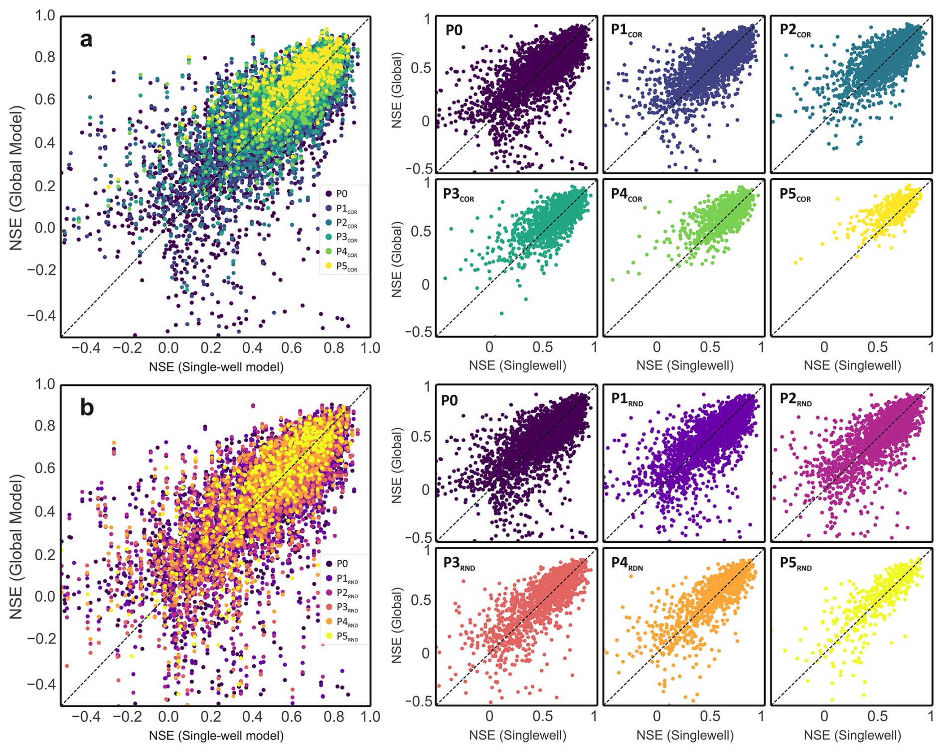 Figure 4Comparison of global and single-well model performance at the well level. Panels (a) and (b) show NSE values of global models (G-Px) plotted against their corresponding single-well models (S-Px) for each monitoring well. Panel (a) includes models trained on dynamically similar subsets (G-PCOR), and panel (b) shows models trained on randomly selected subsets (G-PRND). Colored points indicate generalization stages (P0–P5; cumulative removal of x×500 wells from P0); therefore, the set of wells varies across stages. Right-hand subplots display the same data disaggregated by stage. Points above the 1:1 line mark wells where the global model outperforms its single-well counterpart.