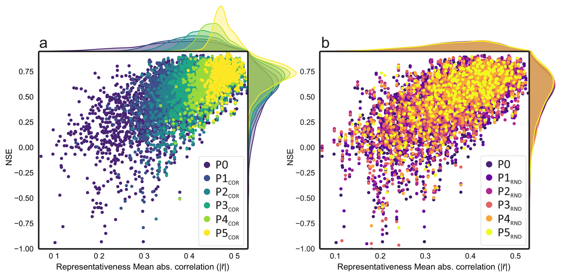 Figure 5Relationship between time series representativeness and model performance. NSE scores of global models are plotted against the representativeness of each well, defined as the mean absolute correlation with all other training wells. Panel (a) shows results for correlation-based removal (P1–P5COR), and panel (b) for random removal (P1–P5RND). Stages are cumulative subsets of P0 obtained by removing x×500 wells. Densities along the top axis indicate the distribution of representativeness across generalization stages (P0–P5). Model performance increases with higher representativeness, particularly under the COR setting, where wells with atypical dynamics are systematically excluded.
