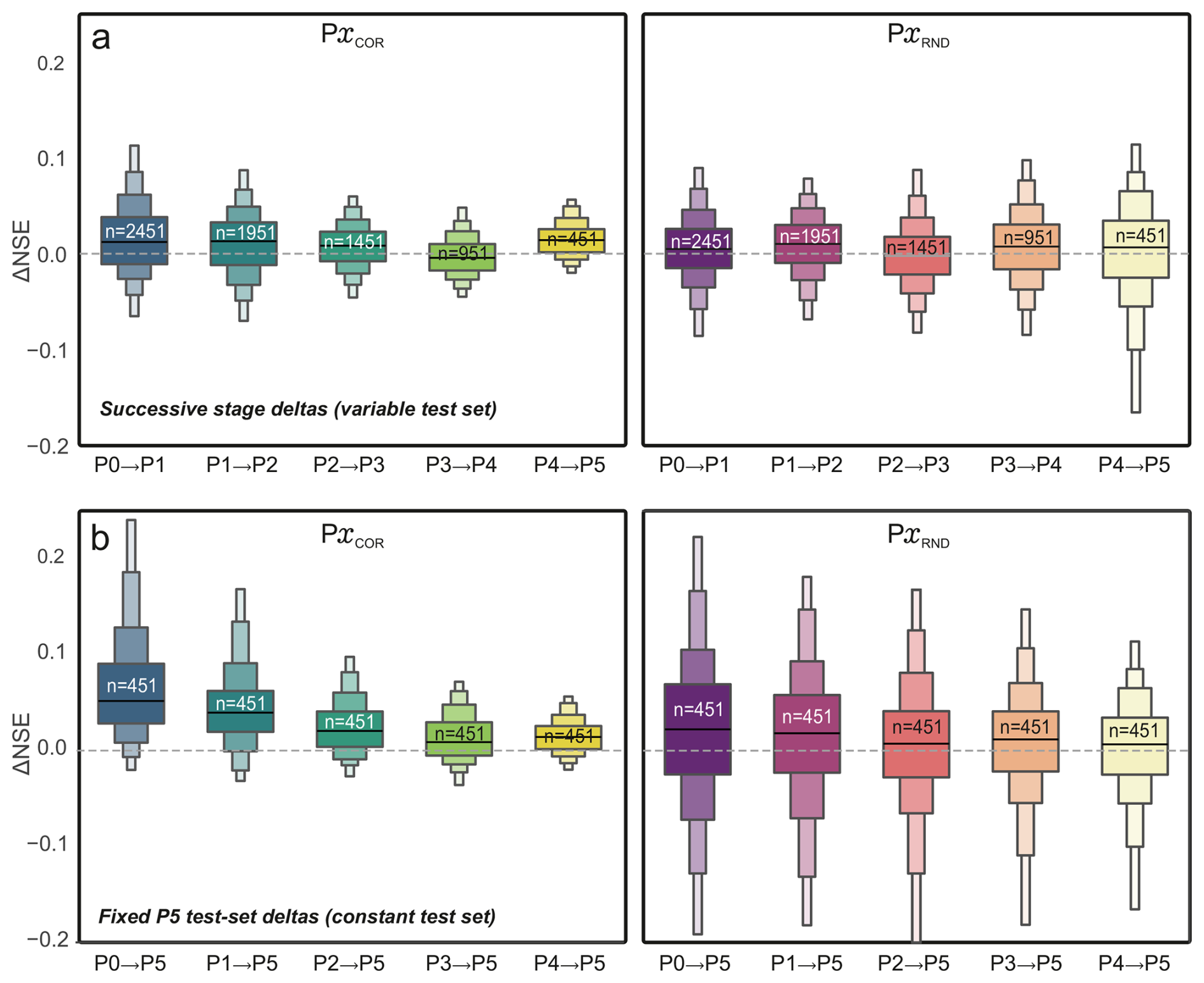 Panel (b) evaluates deltas on a fixed and identical test set, i.e., the wells that constitute the final stage P5 (constant n), thereby isolating training-basis effects from changes in the evaluated well population. For PxCOR, deltas are predominantly positive for early stages and progressively approach zero towards P4 → P5, indicating that the final P5 model achieves systematically higher skill on the representative P5 wells than models trained on less filtered datasets, but that most of this improvement is already realized by intermediate stages (diminishing additional gains thereafter). In contrast, PxRND yields broader, near-zero-centered distributions with substantial positive and negative mass, implying that the final-stage model is not uniformly superior to randomly reduced counterparts on the same P5 wells; rather, gains and losses are site-dependent. Together with Fig. 5, this indicates that the improvements under COR are primarily driven by the targeted exclusion of dynamically atypical wells (i.e., increasing representativeness), rather than by data-volume reduction alone.