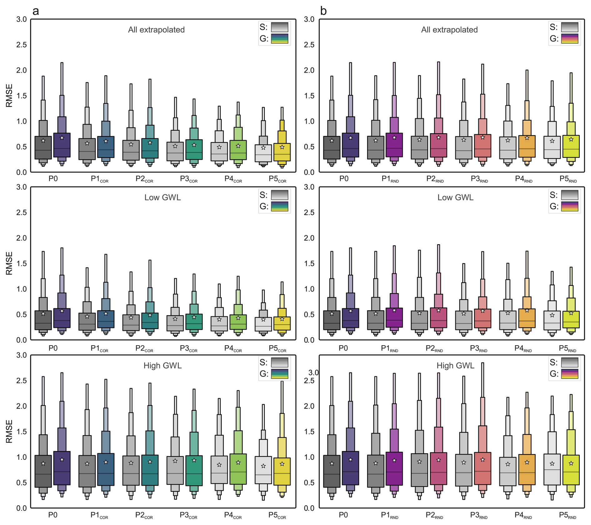 Figure 7Model performance under extrapolated conditions. Boxplots of RMSE for single-well (S) and global (G) models across generalization stages (P0–P5). Panel (a) shows correlation-based stages (G-PCOR) and panel (b) random stages (G-PRND). Results are computed for extrapolated time steps only (top) and split into low (middle) and high (bottom) groundwater-level extrapolations.