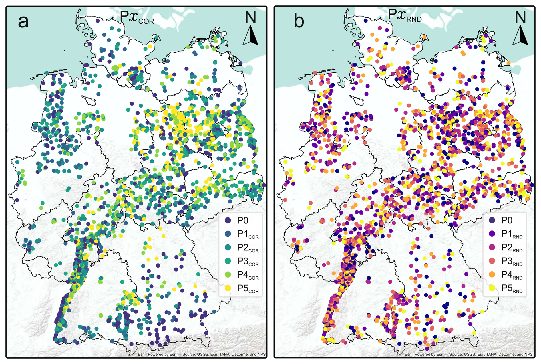 Figure A1Spatial distribution of groundwater monitoring wells used in this study. The panels distinguish between correlation-based (PCOR, a) and random (G-PRND, b) data removal scenarios across six stages (P0–P5). Each stage represents a progressive reduction of the training data set, either by removing wells with low dynamic similarity (PCOR) or through random subsampling (G-PRND). The map highlights how spatial coverage changes with increasing data reduction