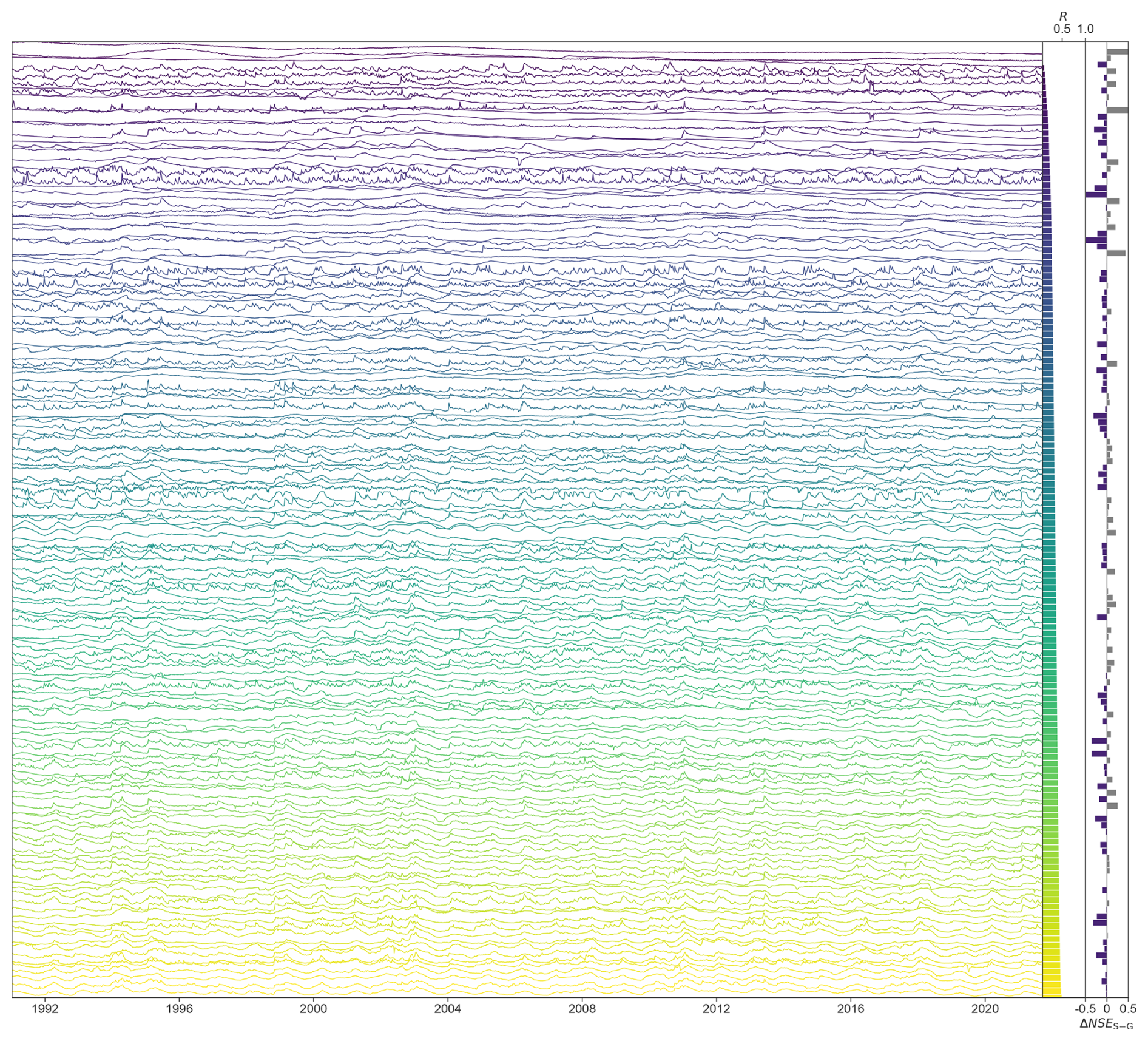 A qualitative view of these relationships is provided in Fig. B1, which displays min–max normalized groundwater level time series for every 20th well, sorted by representativeness, along with the difference in predictive performance (ΔNSE) between single-well and best-performing global models.
