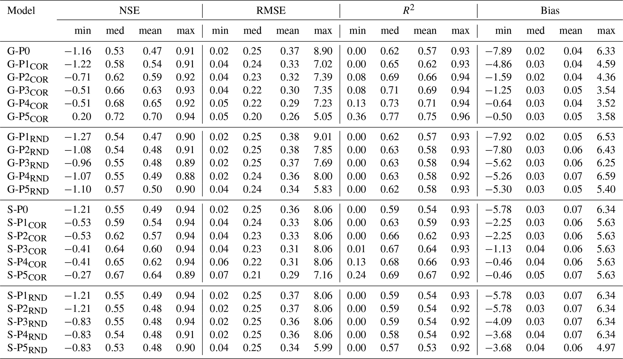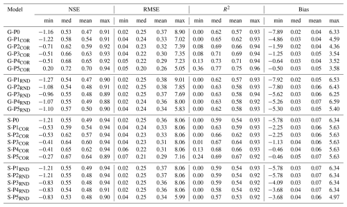 Table 1Overview of performance metrics for global (G) and corresponding single-well (S) models, including Nash–Sutcliffe efficiency (NSE), root mean square error (RMSE), coefficient of determination (R2), and bias. Values are reported as minimum, median, mean, and maximum across all wells for each model configuration.