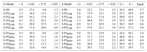 This interpretation is further supported by the summary in Table 2, where the share of poorly performing wells remains around 5 %, and the proportion of high-performing wells (NSE > 0.75) increases slightly, from 9.2 % to 14.9 %, despite the lower number of wells. The global model consistently performs as well as or slightly better than the corresponding local models in the final stages (G > S: 53.2 % at P5RND). While dynamic similarity would be expected to remain constant under random removal, this is not entirely the case for our real-world dataset, as representativeness does not increase continuously but in discrete jumps. At smaller training set sizes, the probability of retaining a more homogeneous subset therefore increases, which can lead to a modest performance gain in later stages. Nevertheless, this improvement is far less pronounced than with correlation-based filtering.