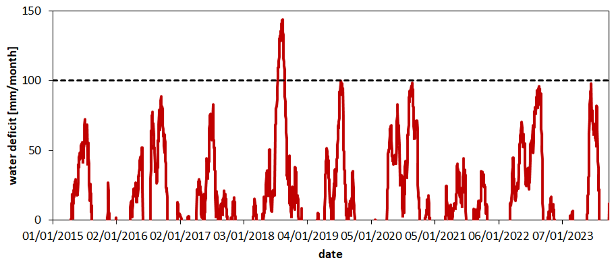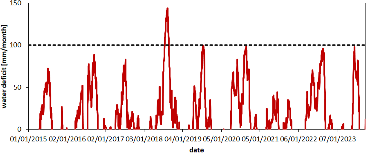 To address this gap, the present study introduces a framework based on neural networks and seasonal trend decomposition. This framework is applied to quantify changes in the soil response function following the 2018 summer drought, a Europe-wide extreme event. During this period, total precipitation in central Europe fell to the lowest percentiles relative to the 1976–2005 reference distribution. In Germany, the summer of 2018 was among the warmest on record and had the lowest precipitation since 1881 (Xoplaki et al., 2025). The response of soil water content to this drought will be analysed with a set of lysimeters. As shown in Fig. 1 for one of the study sites, the monthly water deficit (potential evapotranspiration minus precipitation) peaked in summer 2018, indicating a strong drought during this period.