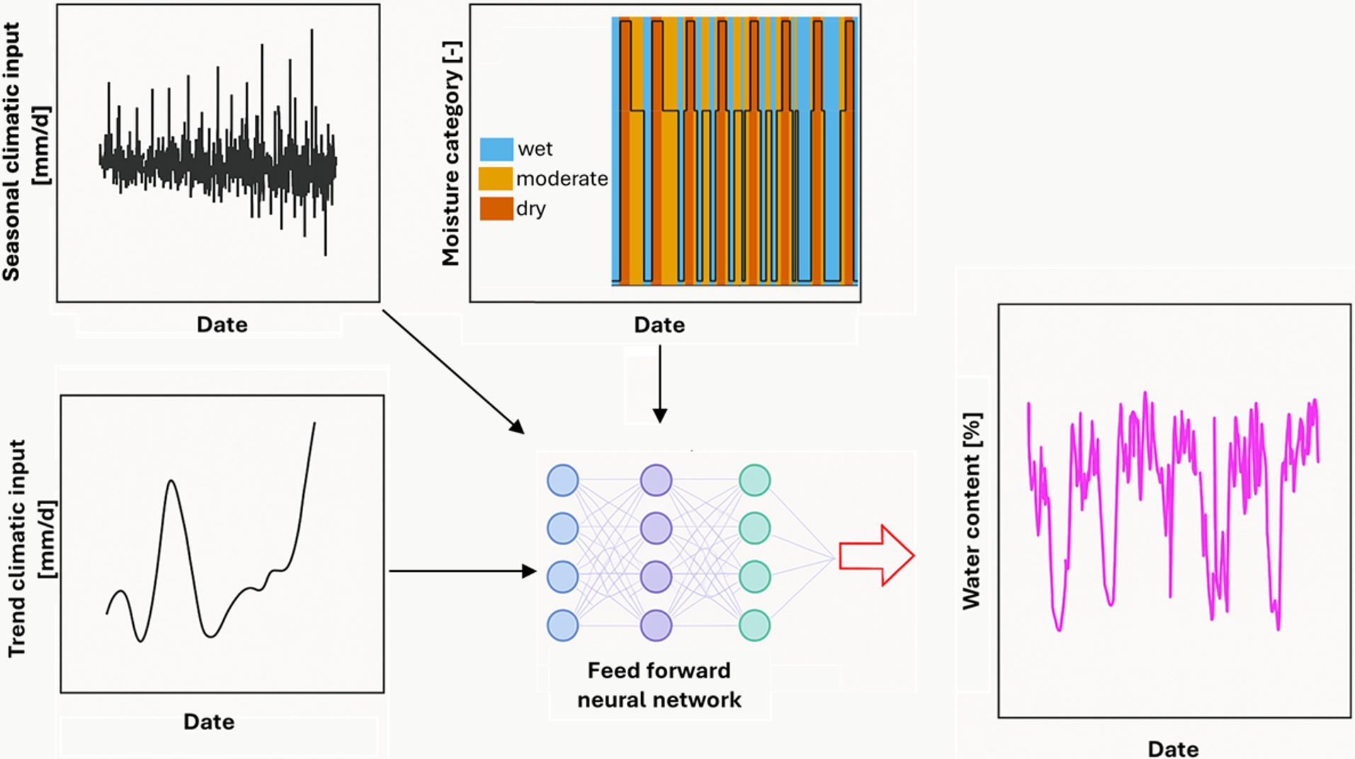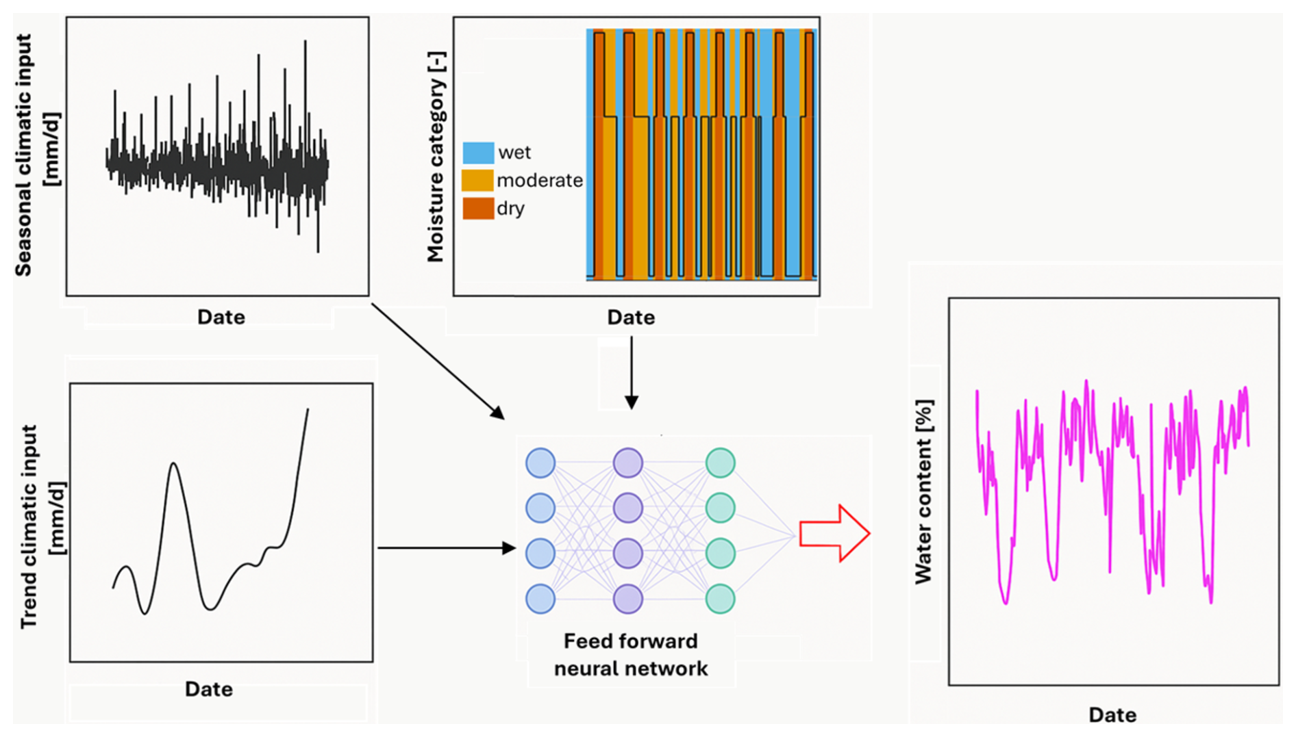 Figure 2Schematic overview of the modelling framework for daily soil water content prediction. Input features include the analysis of a climatic variable (top left), its long-term trend component (bottom left), and the categorical soil water content state (“wet”, “moderate”, “dry”; top middle). These features, derived from observed data, are used to train a feed-forward neural network (centre), which outputs daily predictions of volumetric water content (right). The model thus captures temporal soil water content dynamics based on structured climate signals and categorical conditions.