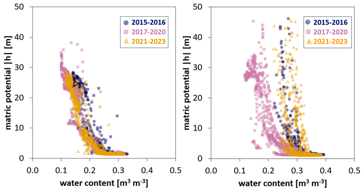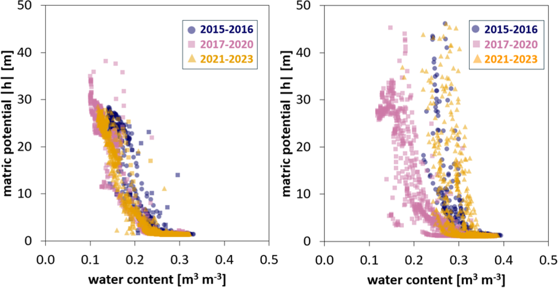 Figure 4Soil water retention curves using data collected between 2015 and 2023 at 10 cm depth. Matric potential is plotted against volumetric water content, with data colour-coded by period: 2015–2016 (blue), 2017–2020 (green), and 2021–2023 (red). (a) Training lysimeter (moved from Dedelow to Bad Lauchstädt). (b) Test lysimeter (original soil from Selhausen in lysimeter station at Selhausen).