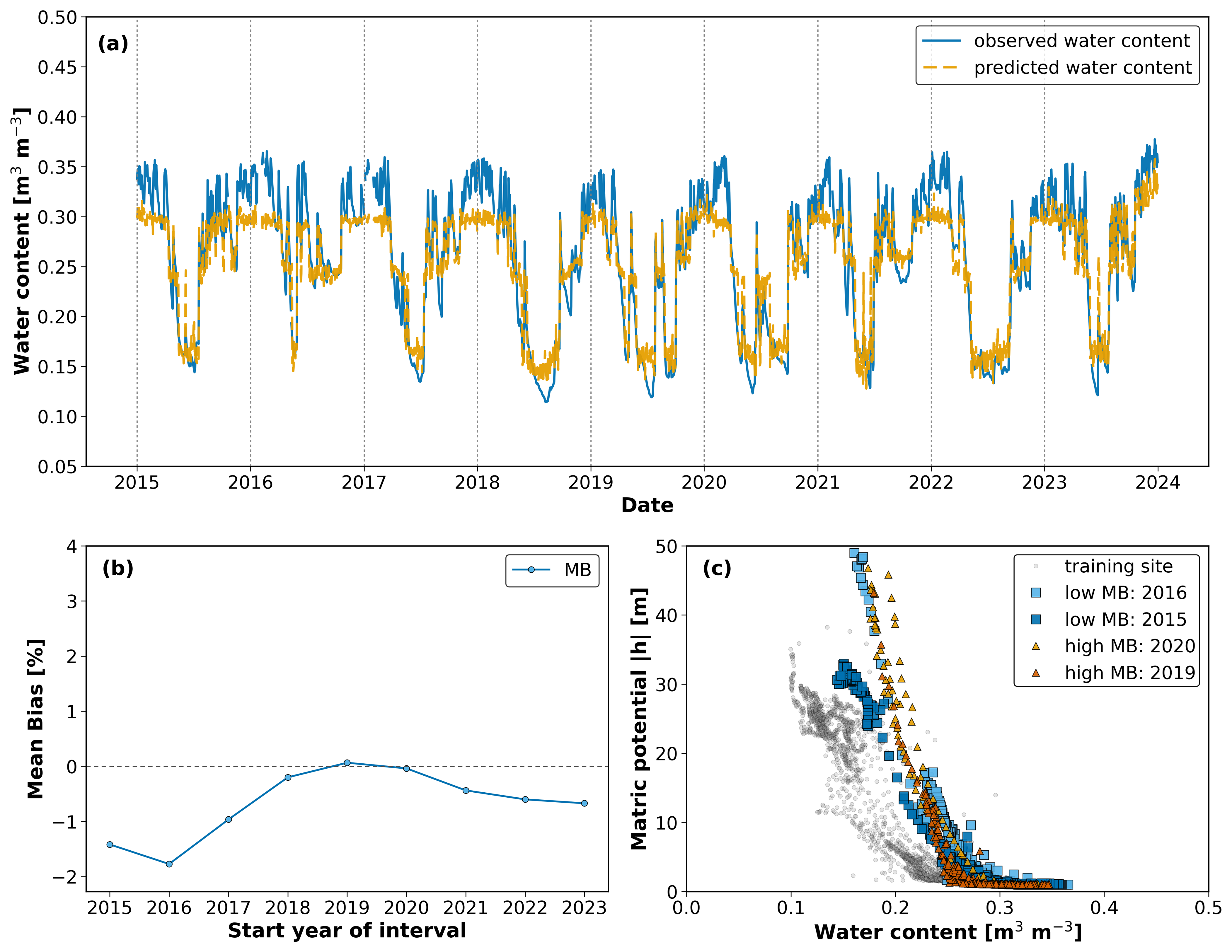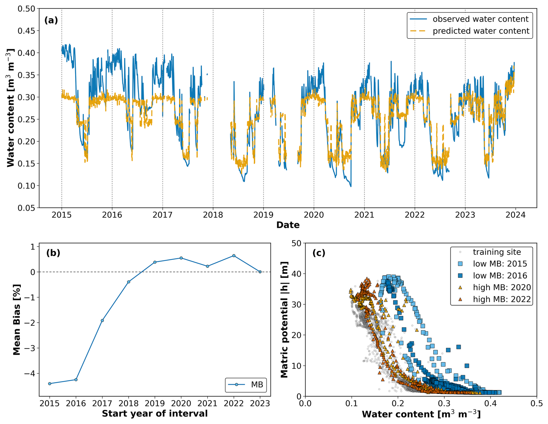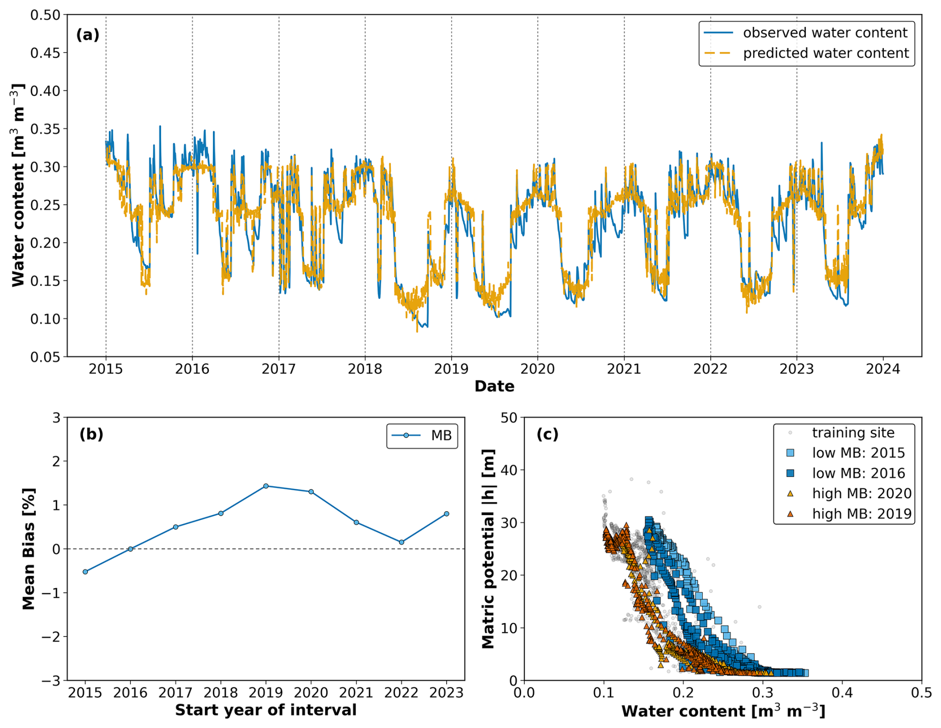 Figure 8Soil water content dynamics (2015–2023) for a Selhausen-origin lysimeter tested at Selhausen. (a) Observed (blue) and predicted (orange) water content shows fair agreement, with underestimation of water contents in the wet season. (b) Mean Bias (MB) fluctuated from negative values in the early years to values close to zero after 2019, but these variations remained below the threshold for change. (c) Soil water retention curves (SWRCs) from the training site (grey) and from selected years with low MB (2015, 2016) and higher MB (2019, 2020) reflect these minor variations, with the 2019 curve showing the strongest deviation yet remaining close to the training reference, consistent with the stable classification. The apparent cutoff at the wet end in (a) arises from the use of absolute rather than normalized values during training, as discussed in Sect. S1.