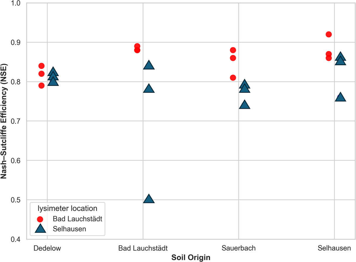 Figure 9Spread of Nash–Sutcliffe efficiency (NSE) values across different soil origins and test locations. Each symbol represents one lysimeter from a given origin (x axis) evaluated at Bad Lauchstädt or Selhausen (indicated by colour). The results highlight the influence of climate–soil interactions on model performance. Notably, Bad Lauchstädt-origin soils exhibited strong performance at their origin but a wider and lower range when tested at Selhausen, indicating increased variability in soil hydraulic behaviour and divergence in soil–climate response.
