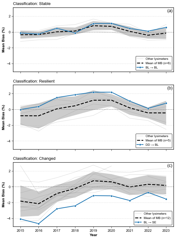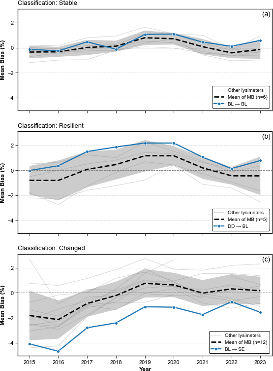 Figure 10Temporal evolution of Mean Bias (MB) for three representative lysimeter replicates, each classified into one of three soil hydraulic response categories: (a) “stable”, (b) “resilient”, and (c) “changed”. Thick dashed lines indicate the mean of the MB trend across all lysimeters within each classification group, with sample size (n) specified in the legend. Shaded areas represent ±1 standard deviation. Thin grey lines show individual MB trajectories of the remaining lysimeters in each group. Highlighted blue lines depict selected replicates originating from and/or tested at distinct sites: (a) BL → BL (soil material from Bad Lauchstädt tested at its origin), (b) DD → BL (soil material from Dedelow tested at Bad Lauchstädt), and (c) BL → SE (soil material from Bad Lauchstädt tested at Selhausen). These examples illustrate contrasting temporal patterns in hydraulic response, ranging from sustained stability to progressive divergence from the trained site dynamics.