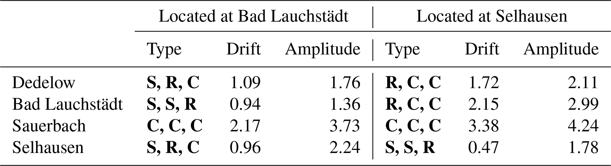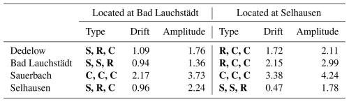 Table 1Resilience of soil water content response function for the four soil materials translocated to Bad Lauchstädt and Selhausen. The “type” describes the class of response function of the individual lysimeters (S for “stable”, R for “resilient” and C for “changed”). The “drift” is the average value of the three lysimeters with the difference in Mean Bias (MB) between years 2023 and 2015. The “amplitude” is the maximum difference of the Mean Bias between the first year (2015) and the years between 2018 and 2022 (denoted as year 20xx).