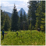 The vegetation of the grassland plot consists of horsetails (Equisetum spp.), small alpine flowers (Succisa pratensis, Leontodon helveticus, Orchis mascula), grasses, and scattered moss (Selaginella helvetica). The mean slope is 18°. The soil surface is more uniform than for the plot in the clearing. However, there were small “terraces and lobes”, which could be attributed to solifluction and/or cattle trampling. The soil profile consists of an A horizon underlain by a reduced Bg horizon. The A horizon is an organic rich horizon up to 7 cm deep, and a topsoil horizon, composed of clay and organic material extending to 25 cm below the soil surface. The Bg horizon is composed of reduced clay that extended to at least 75 cm. Root density was highest in the upper 7 cm of the soil and decreased in the topsoil. The roots were small (Ø < 0.5 mm). There were only a few large pieces of half-decomposed wood throughout the soil profile.